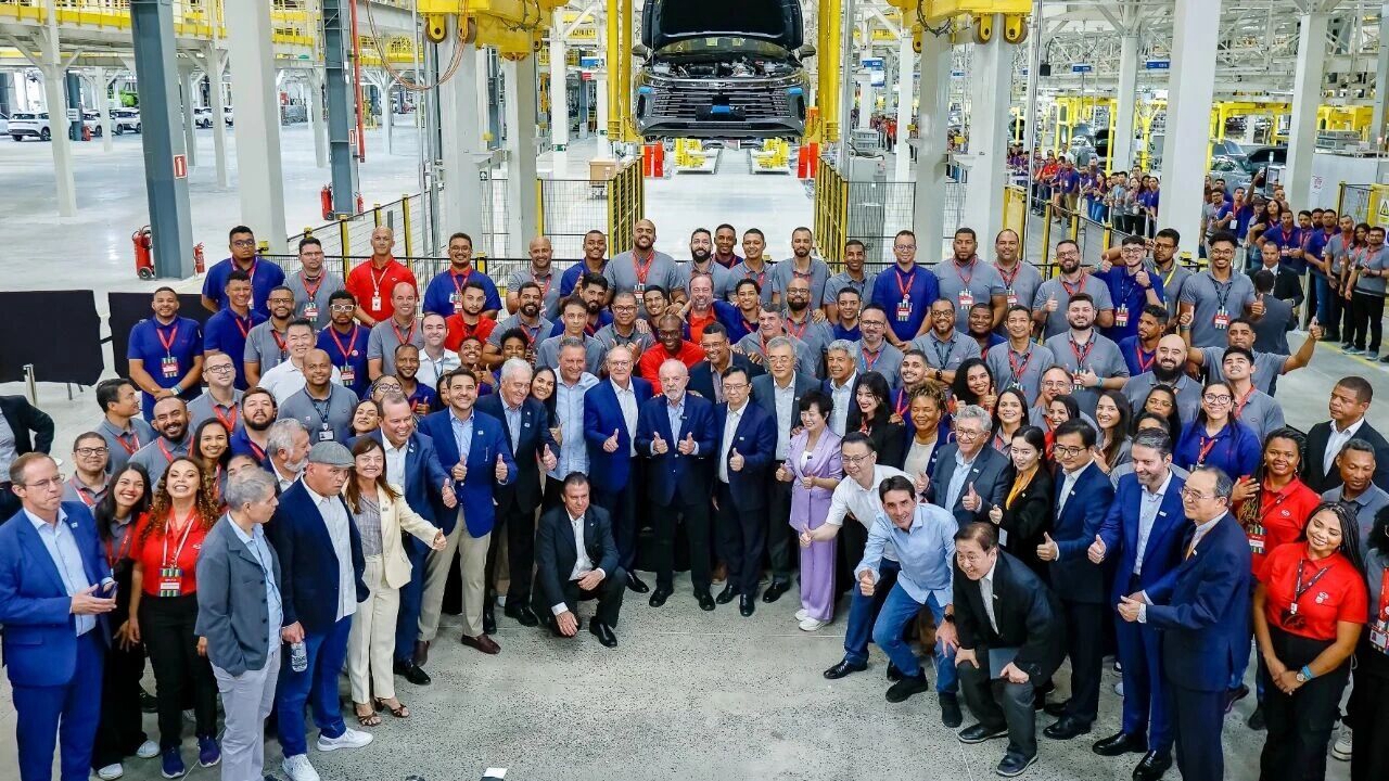 Brazilian President Lula, officials from China and Brazil, BYD chairman and president Wang Chuanfu, and employees at BYD’s passenger car plant in Camacari, Brazil, pose for a group photo Oct. 9.