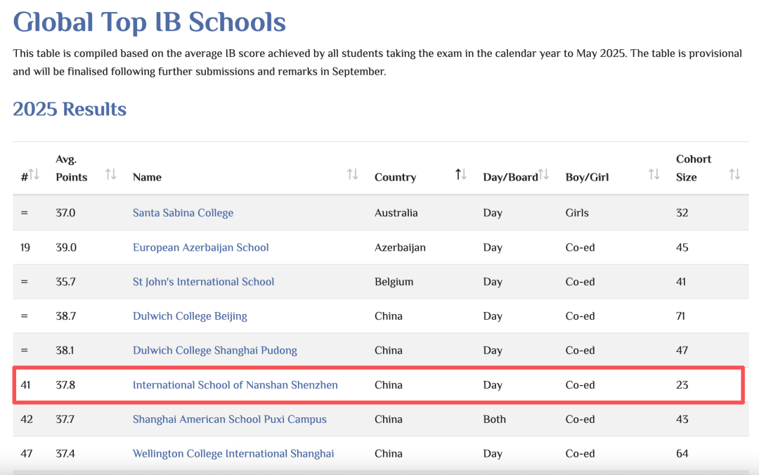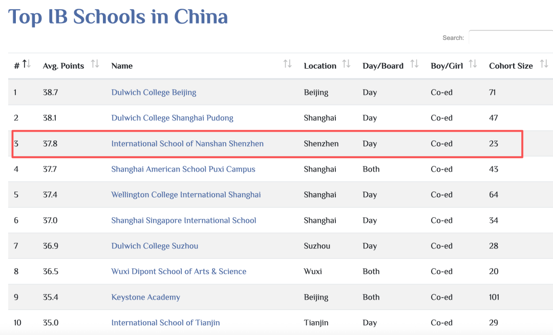 According to the latest ranking by Education Advisers Ltd., a U.K.-based education consultancy specializing in international and private schools, ISNS ranks among the Top 3 IB Schools in China and the Top 50 IB Schools Worldwide.