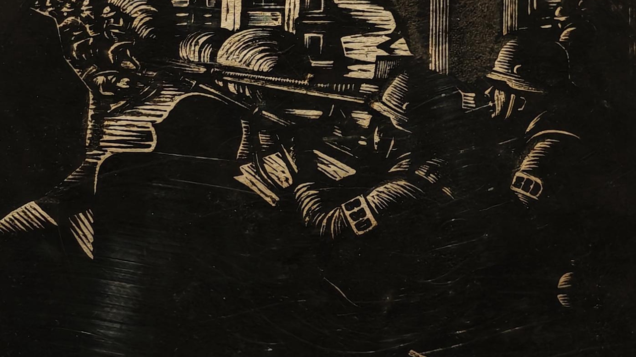 Hu Yichuan’s harrowing print, “The Eight hundred Heroes” (c. 1937-1938), is a prime example of this eyewitness reportage. Commemorating the legendary defense of the Sihang Warehouse, a battle Hu witnessed firsthand, the print plunges the viewer into the brutal chaos of a last stand. There is no polished heroism here — jagged, Expressionist-inspired gouges capture the desperate, claustrophobic reality of the fight, serving as an authentic testament to the tragic cost of courage.