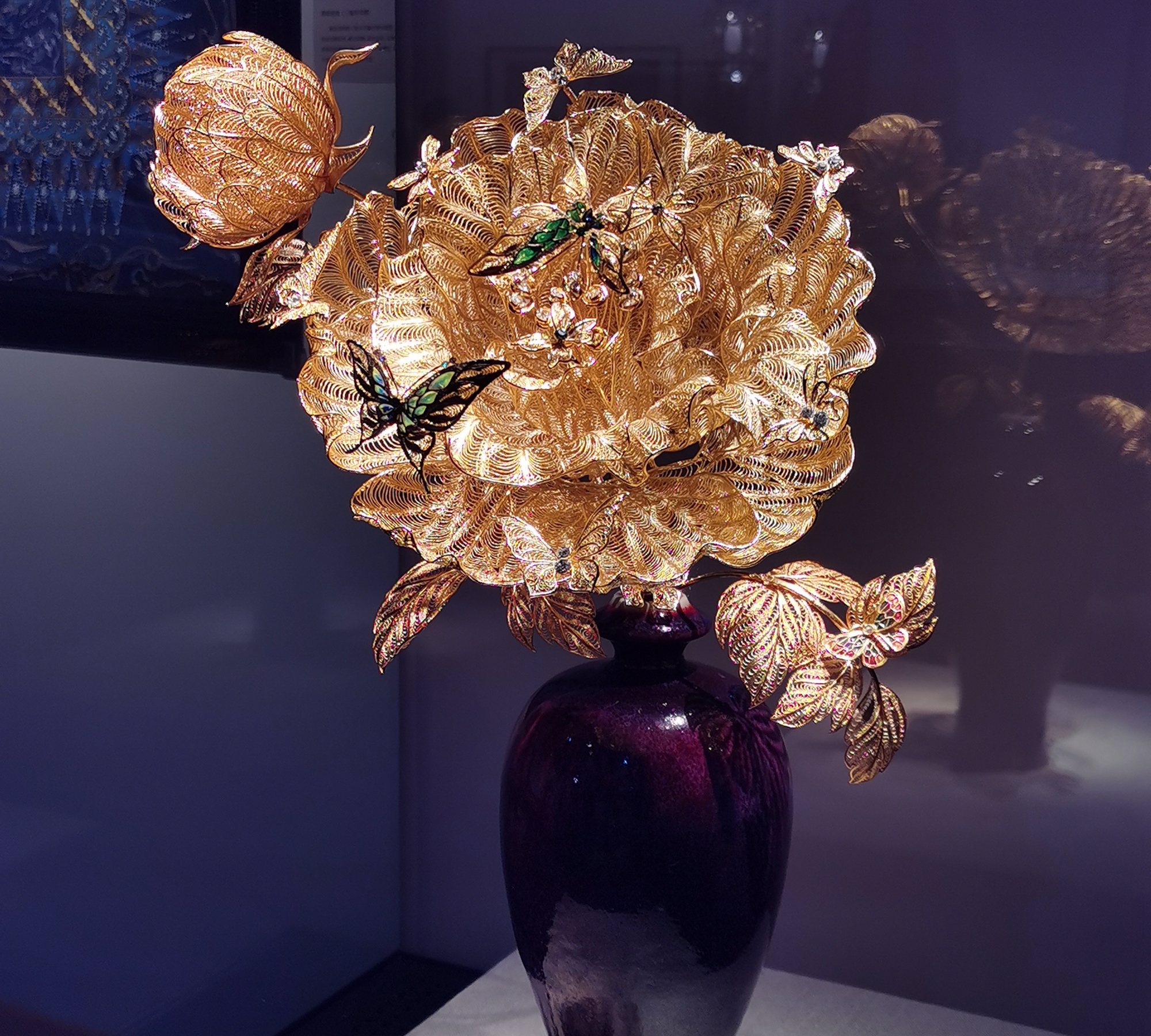 Cloisonné enamelworks and a painted ceramic panel on display.