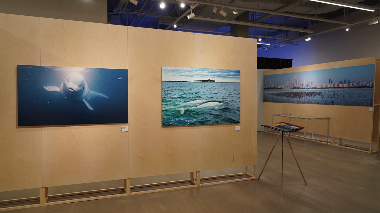 A speaker introduces marine wildlife during a guided tour at a marine art exhibition, highlighting the beauty and fragility of ocean life.