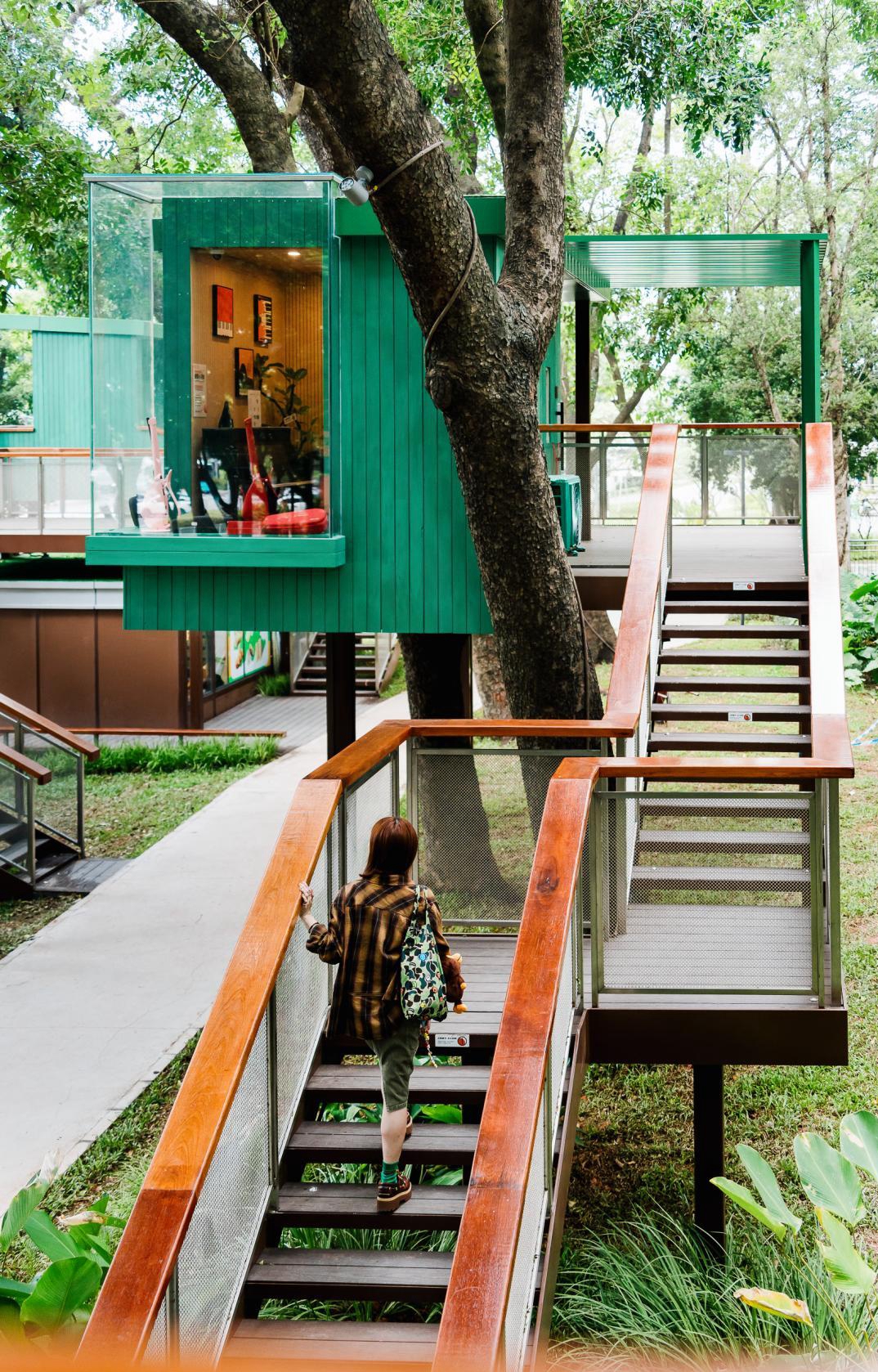 A girl climbs the stairs to a smart treehouse music studio in Futian District, part of an innovative public space blending music and nature. Photo from WeChat account "ShenzhenLook"