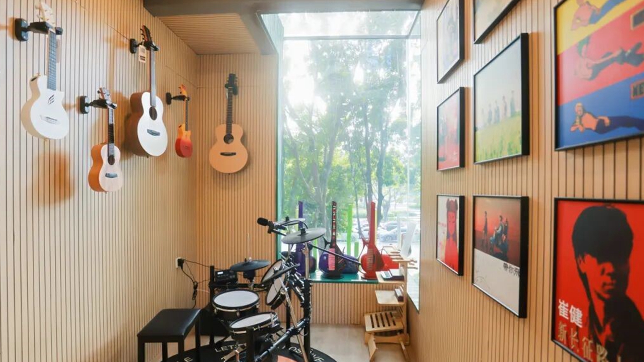 The drum room features electronic drums and stringless smart guitars with LED fretboards. Courtesy of Futian Cultural Tourism and Urban Services