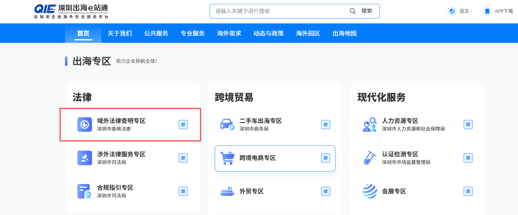 The navigator is available on the Shenzhen International Business e-Station (www.qhqie.com) homepage under the “Go Global” panels. It is tightly integrated with news updates, official notices, and a case library to deliver a one‑stop, consolidated legal service experience.