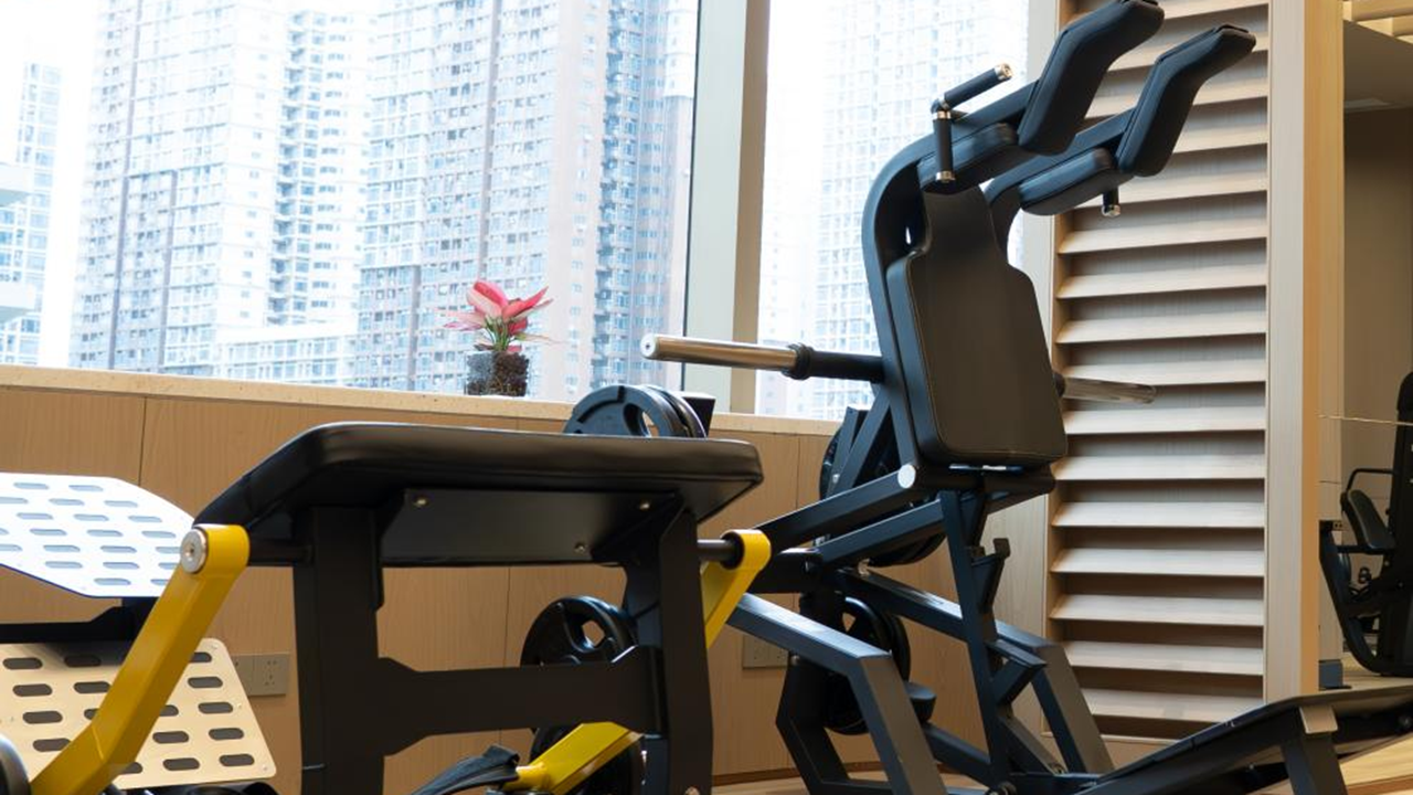 The gym and a fully furnished apartment unit inside the Qianhai Longwan International Talent Apartments.