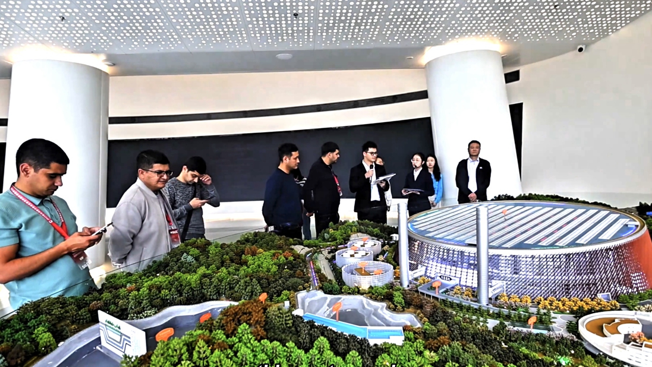 Uzbekistan delegation members listen to the introduction of the Longgang Energy Ecological Park beside a sand table Oct. 29. Photos by Liu Xudong