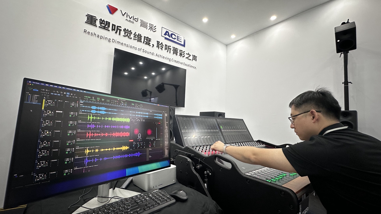 Jin Ruifeng, technical director of UWA Audio Vivid, operates the mixing console at the production room.