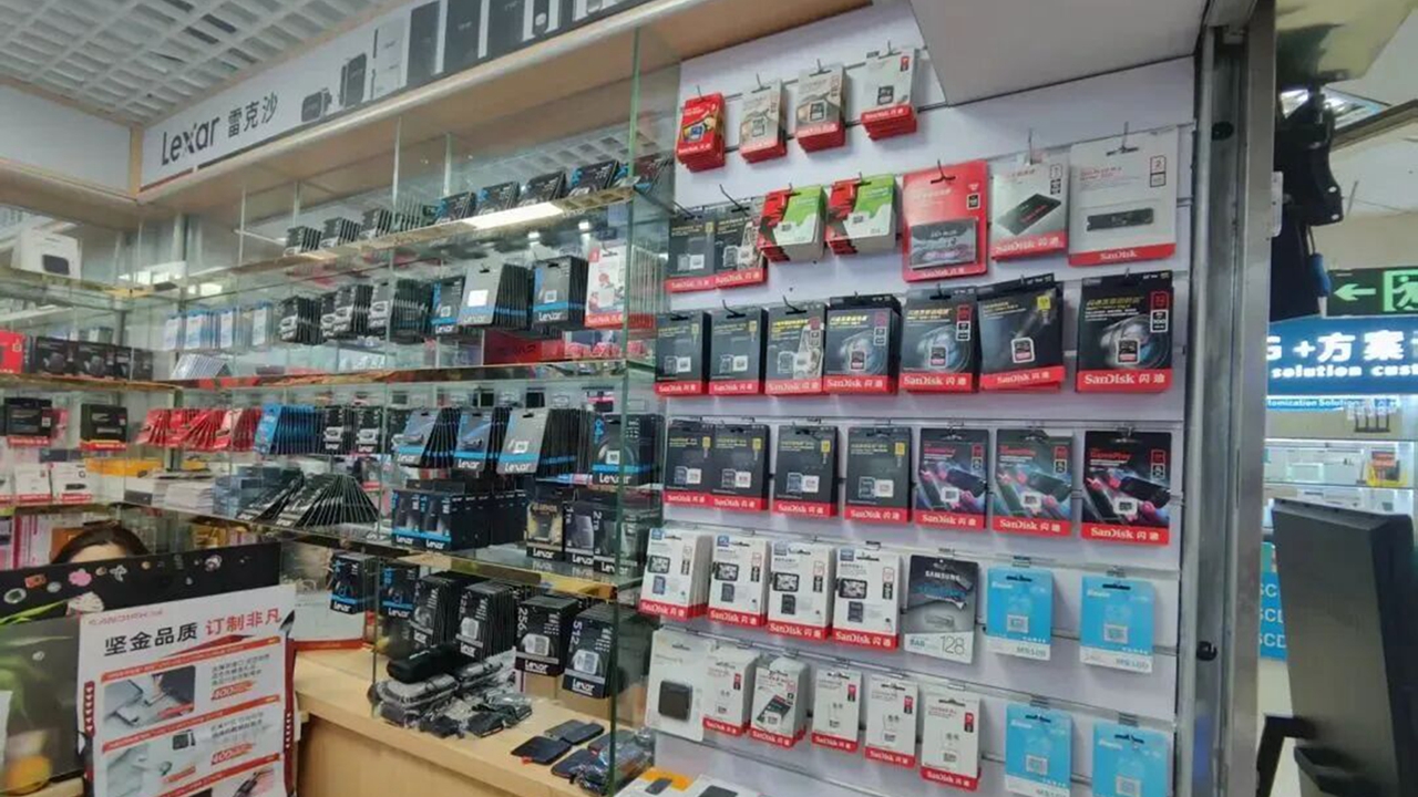 Memory chips and storage products on display at a retail booth in Huaqiangbei amid a wave of rising prices driven by global AI demand. Shenzhen Economic Daily