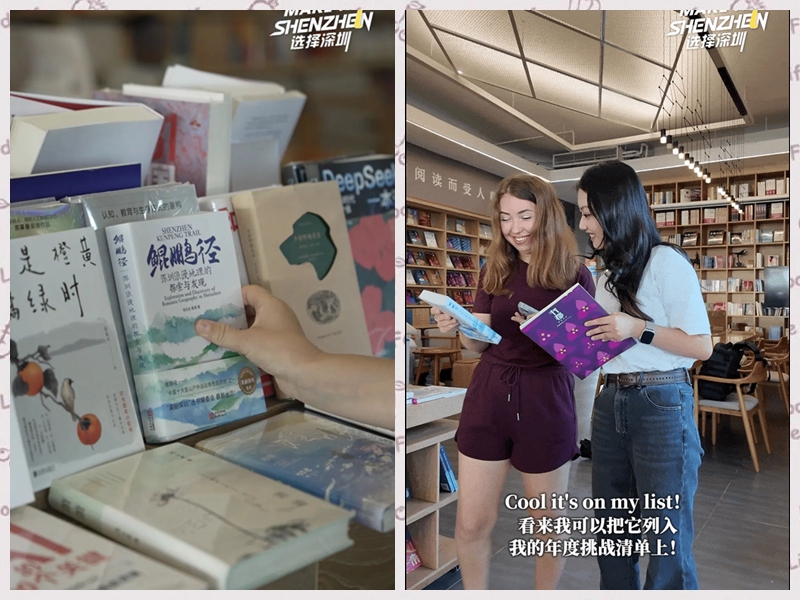 骑行稍歇,两人走进公园书吧喝茶小憩。书架上,一本介绍“鲲鹏径”的书引起了他们的注意。得知“鲲鹏径”是深圳最长的远足径后,Marina表现出浓厚兴趣,并表示日后要亲自体验。
