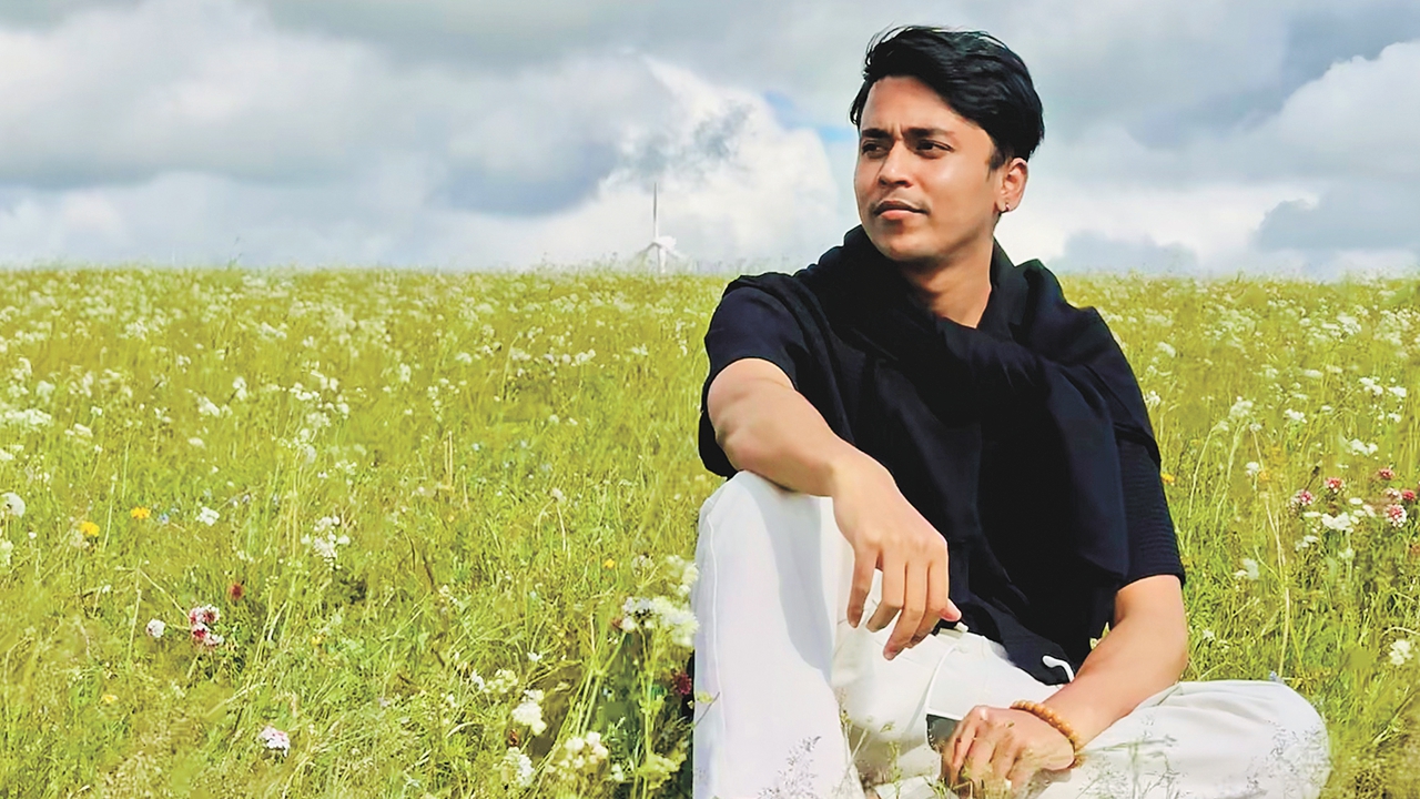 Vivek Yadav enjoys the beautiful scenery sitting on the grassland in Ulanqab, a prefecture-level city in Inner Mongolia, in July 2025.