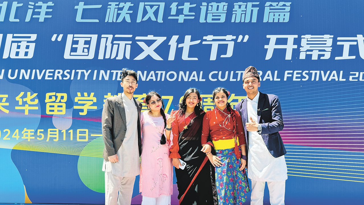 Vivek Yadav (R) poses for a group photo with Nepalese students at the International Cultural Festival of Tianjin University in May 2023.