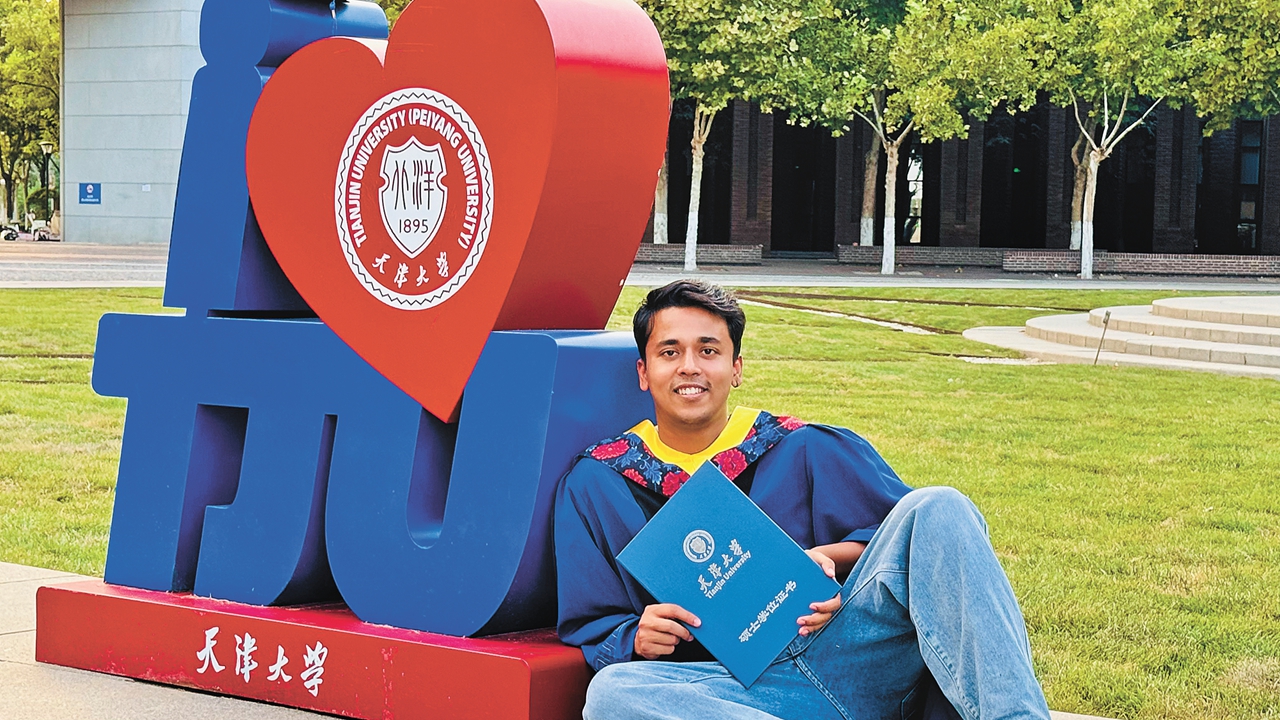 Vivek Yadav, holding his master's degree certificate, takes a graduation photo at Beiyangyuan Campus, Tianjin University, in August 2025. Photos courtesy of the interviewee