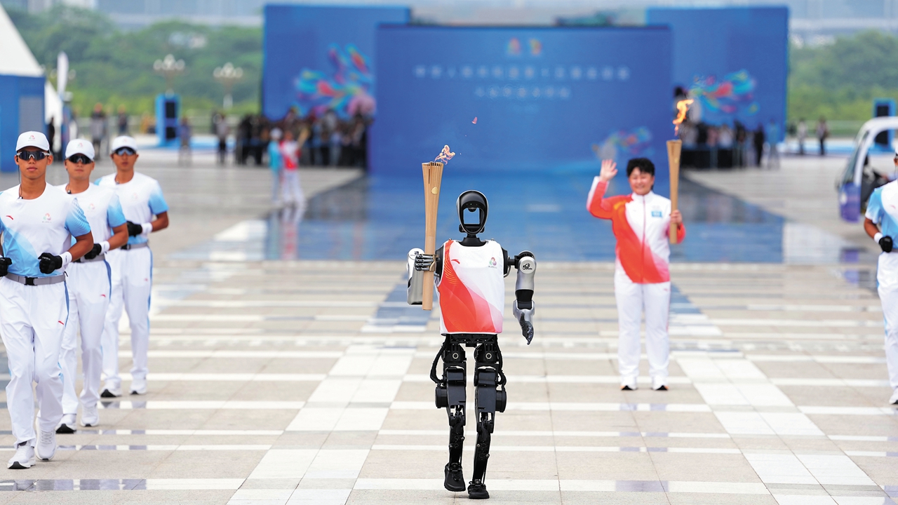 Kuavo, a humanoid robot developed by Shenzhen-based Leju Robot, takes part in the torch relay at Lianhua Hill Park in Futian District on Nov. 2. Xinhua