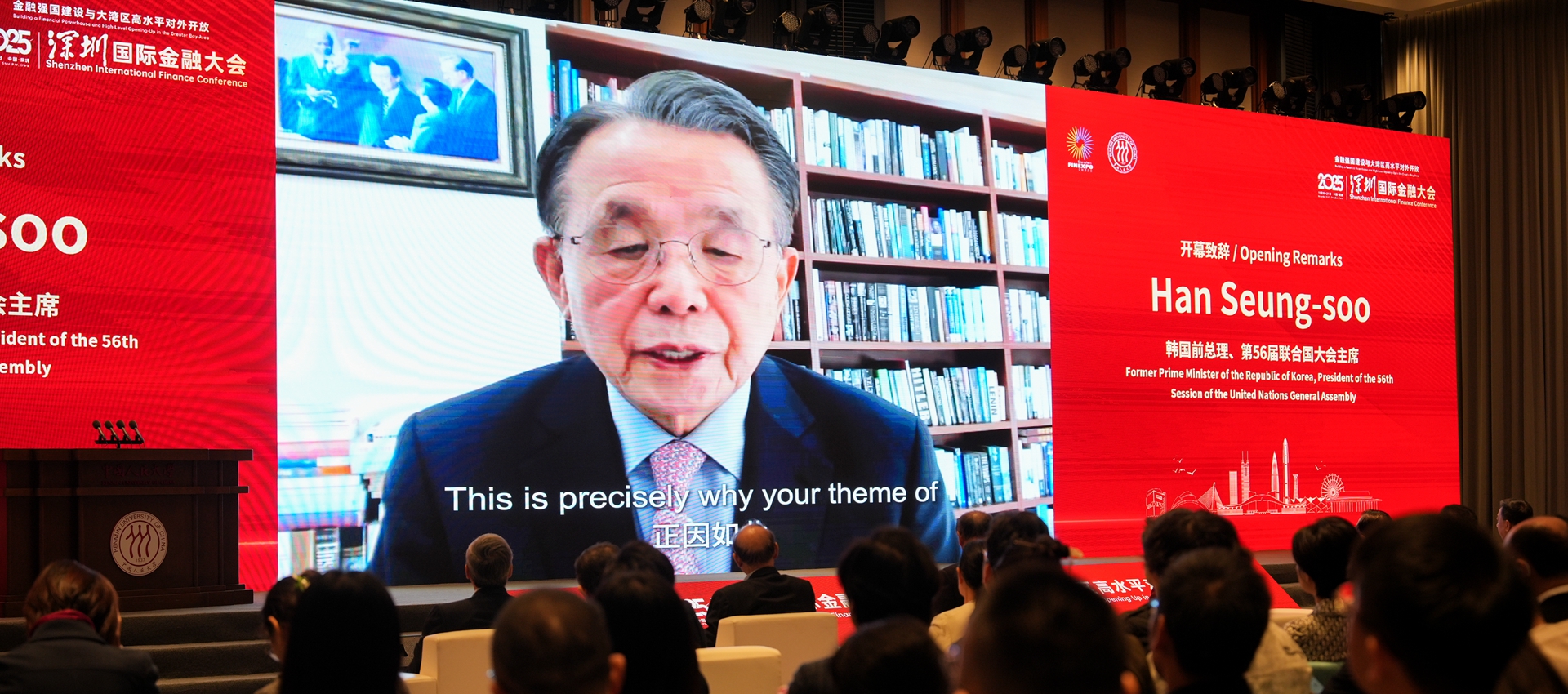 Former South Korean Prime Minister Han Seung-soo delivers a video address, praising Shenzhen’s rising global stature and outlining a vision for its financial future. Lin Jianping