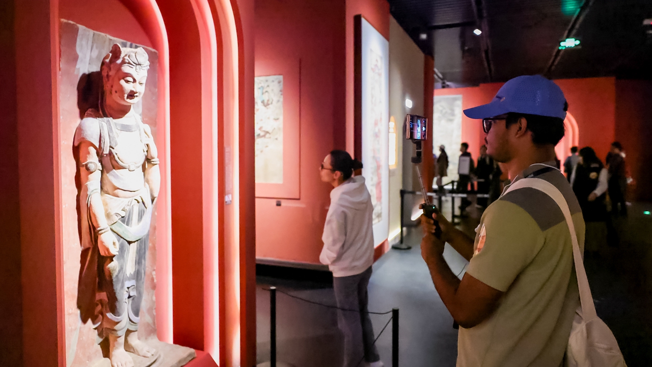 An international visitor captures the beauty of a statue at the “Dunhuang Splendors: Culture and Art Exhibition of Mogao Grottoes” at Nanshan Museum.