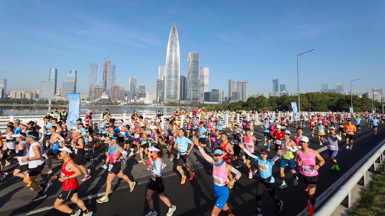 Runners pass through scenic Shenzhen Talent Park and cross Houhai Bridge during the 2024 Shenzhen Marathon on Dec. 1, 2024. Zhou Hongsheng