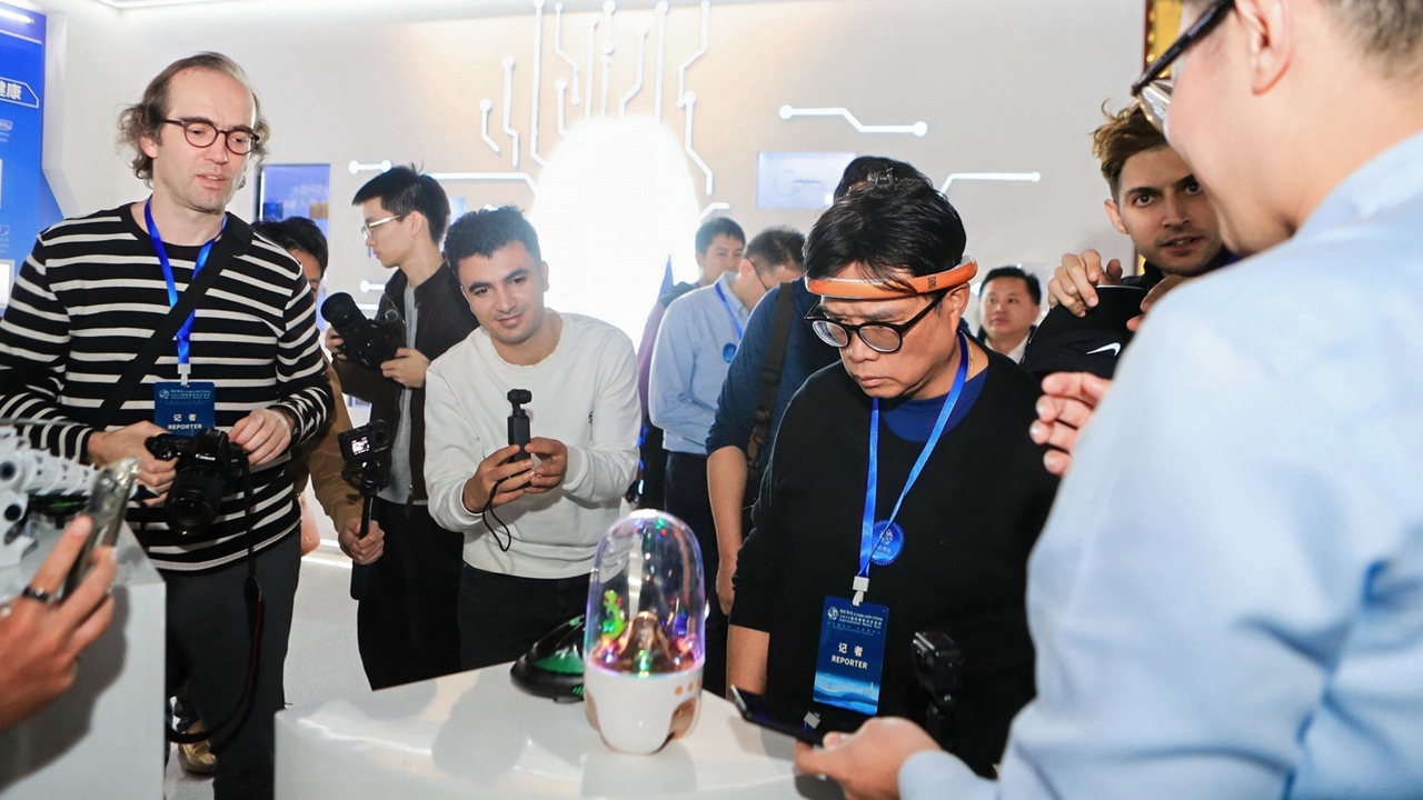 Delegation members try a product at the Industrial Innovation Center for Brain Science and Technology.