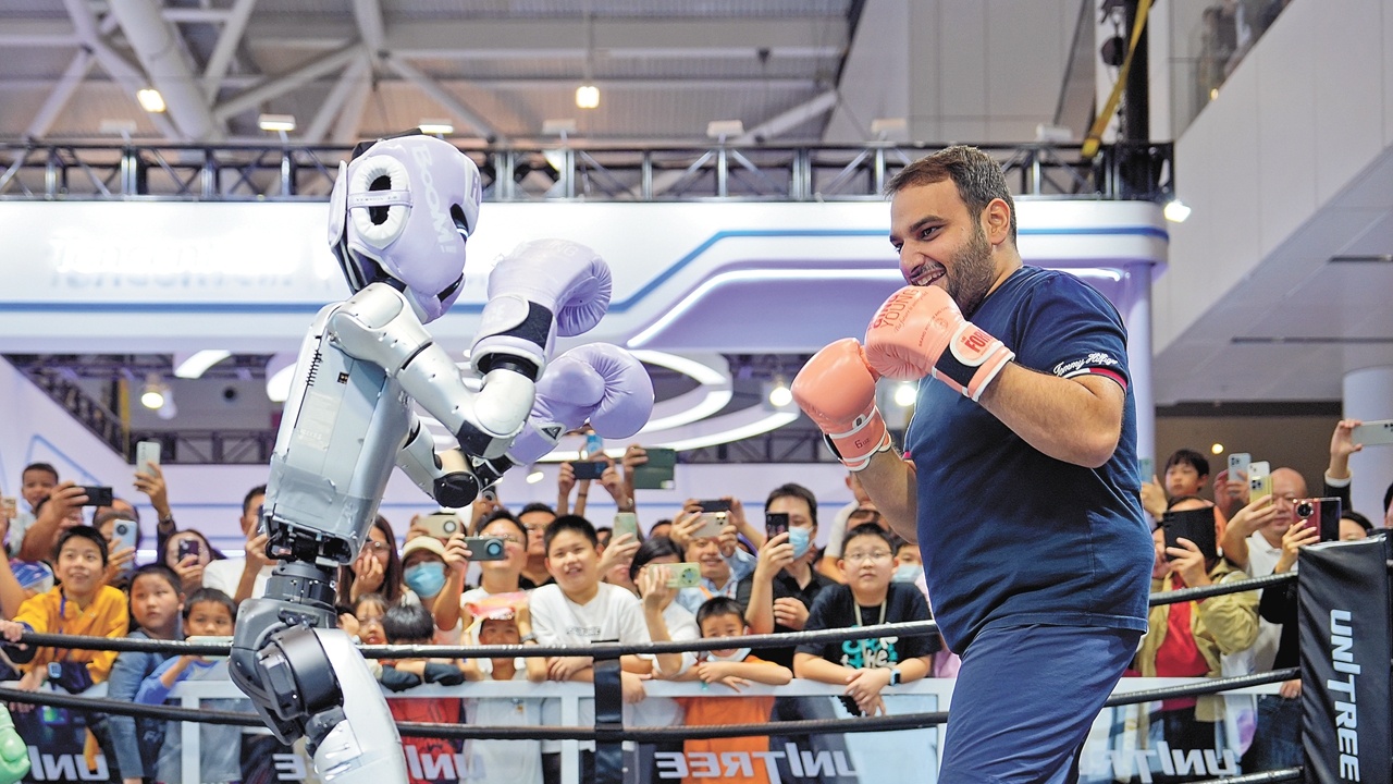 Warsi Syed Muhammad Ahmad Hasan boxes with a robot during a visit to the 27th China Hi-Tech Fair (CHTF) in Shenzhen this November. Lin Jianping