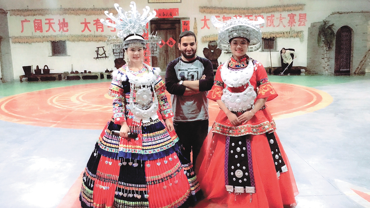 Warsi Syed Muhammad Ahmad Hasan poses for a photo with two performers after watching a folk performance in Guilin City, Guangxi Zhuang Autonomous Region. Courtesy of the interviewee