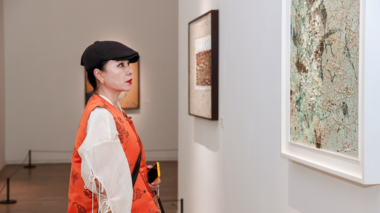A visitor observes a ceramic painting at the Guangming Culture and Arts Center. Courtesy of the organizer