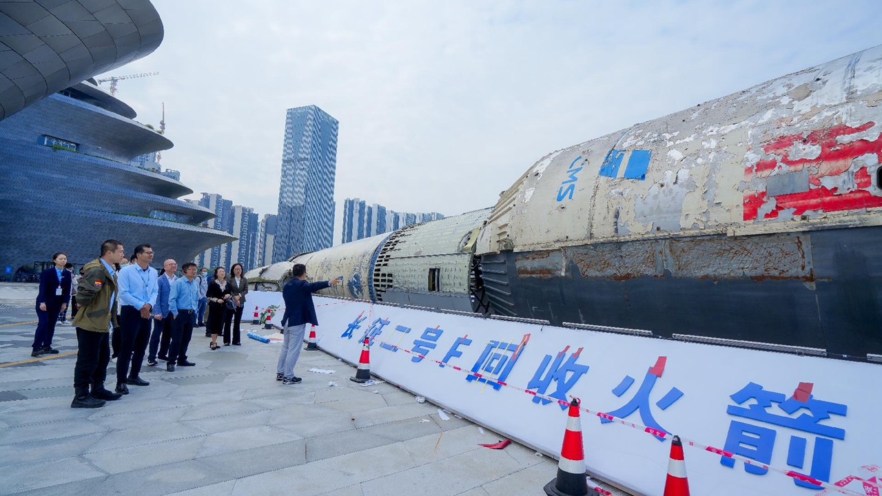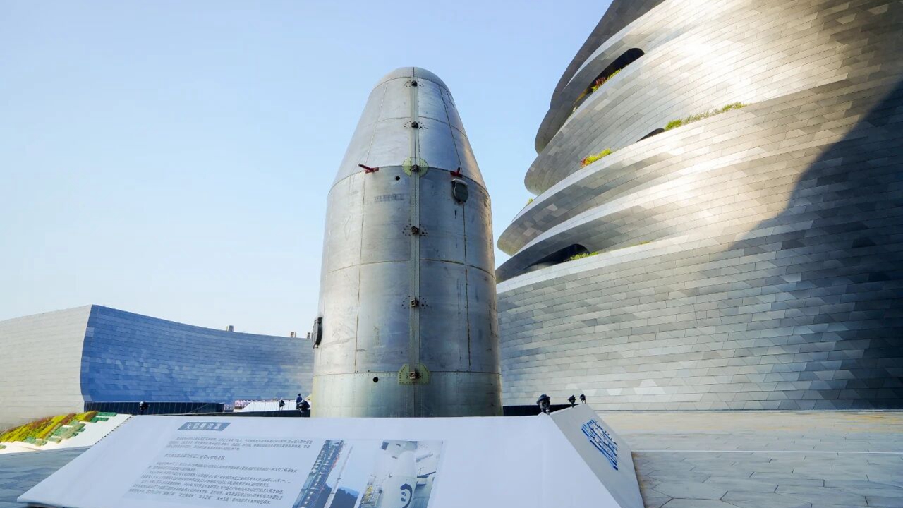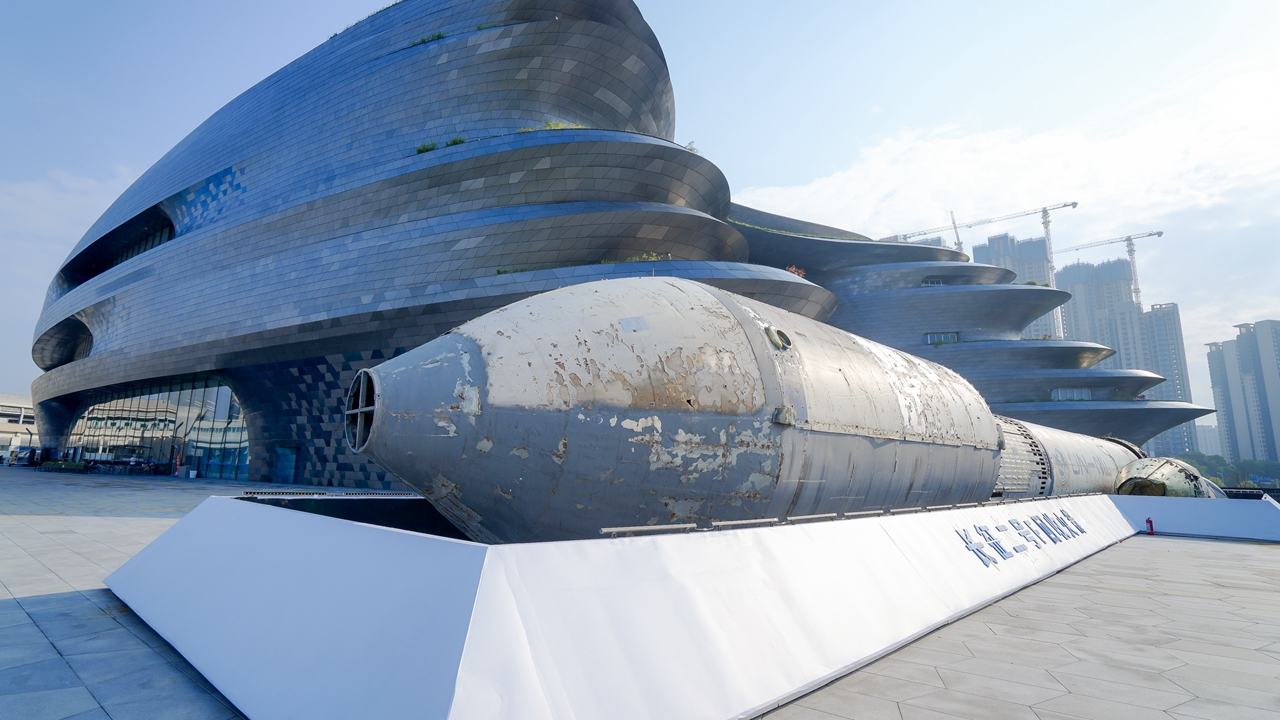 A payload fairing from a Long March rocket is displayed outside the Shenzhen Science & Technology Museum.
