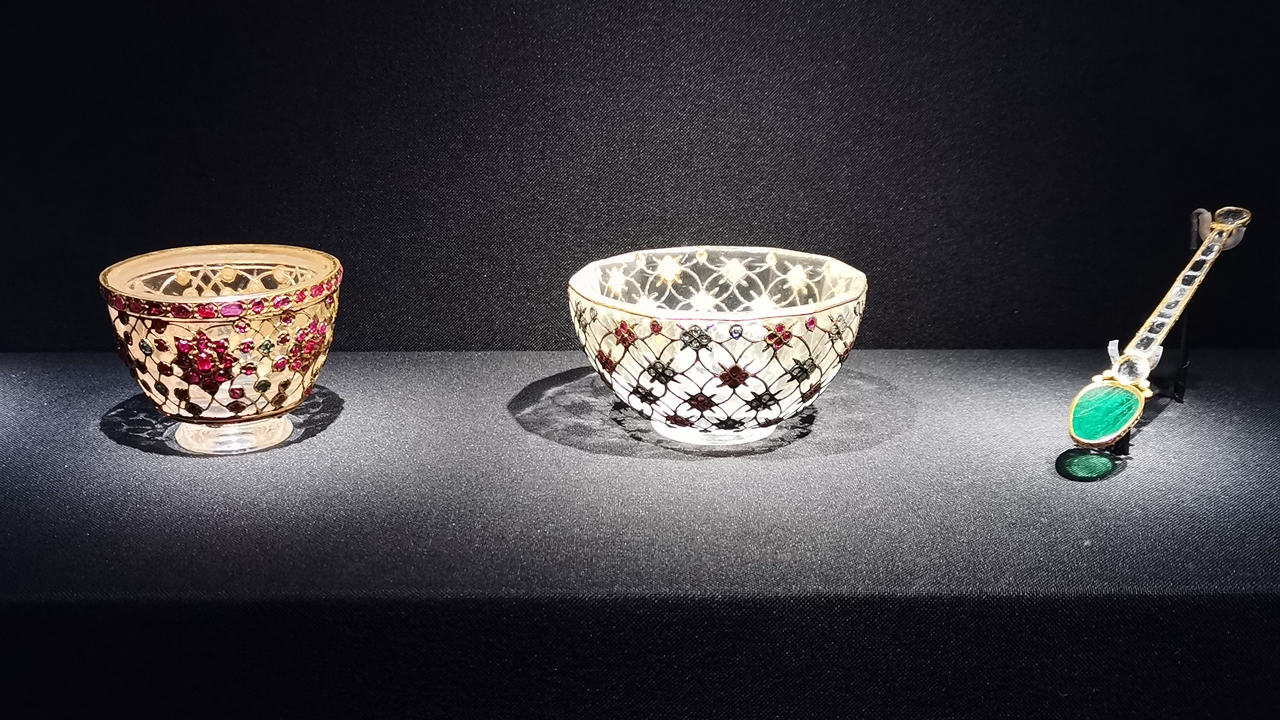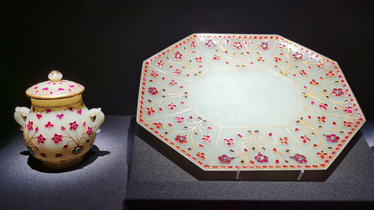 Daggers and bracelets set with rubies, emeralds, and diamonds. Luminous rock crystal, intricately carved jade, and a gold coin as large as a plate. These are among the dazzling objects on display in “Blossoms and Blades: Treasures of the Mughal Court in 16-19 Centuries” at Shenzhen Museum’s history and folk culture division.