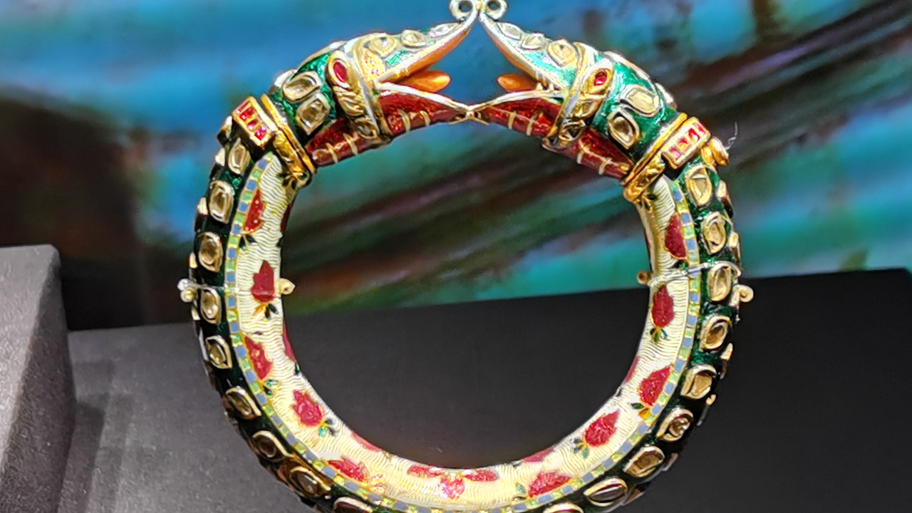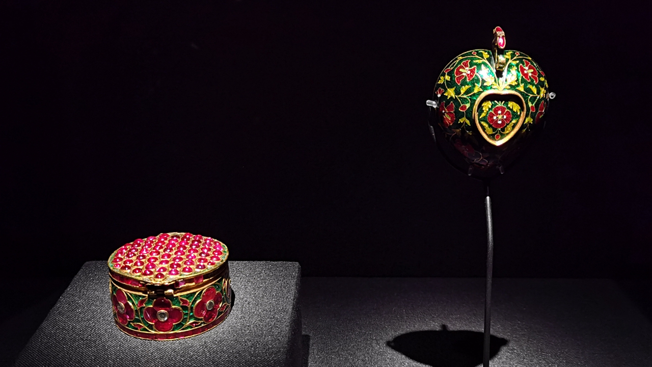 A 17th-century gold and enamel bracelet set with diamonds and rubies from the Mughal Empire is on display at the “Blossoms and Blades” exhibition at Shenzhen Museum’s history and folk culture division. Photos by Cao Zhen