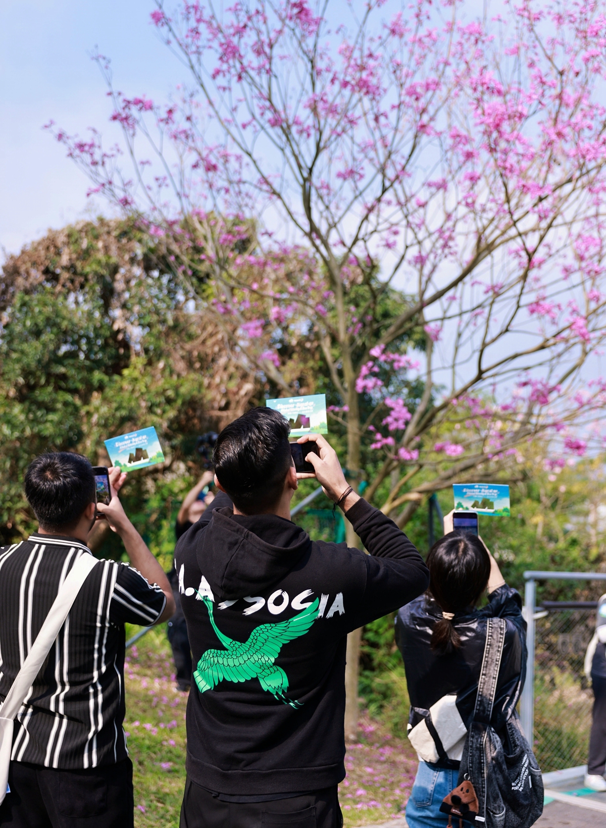 Participants pause to photograph a blooming tree along the Xili Lake Greenway, capturing a scenic moment during the nature-themed segment of the Nanshan tour.