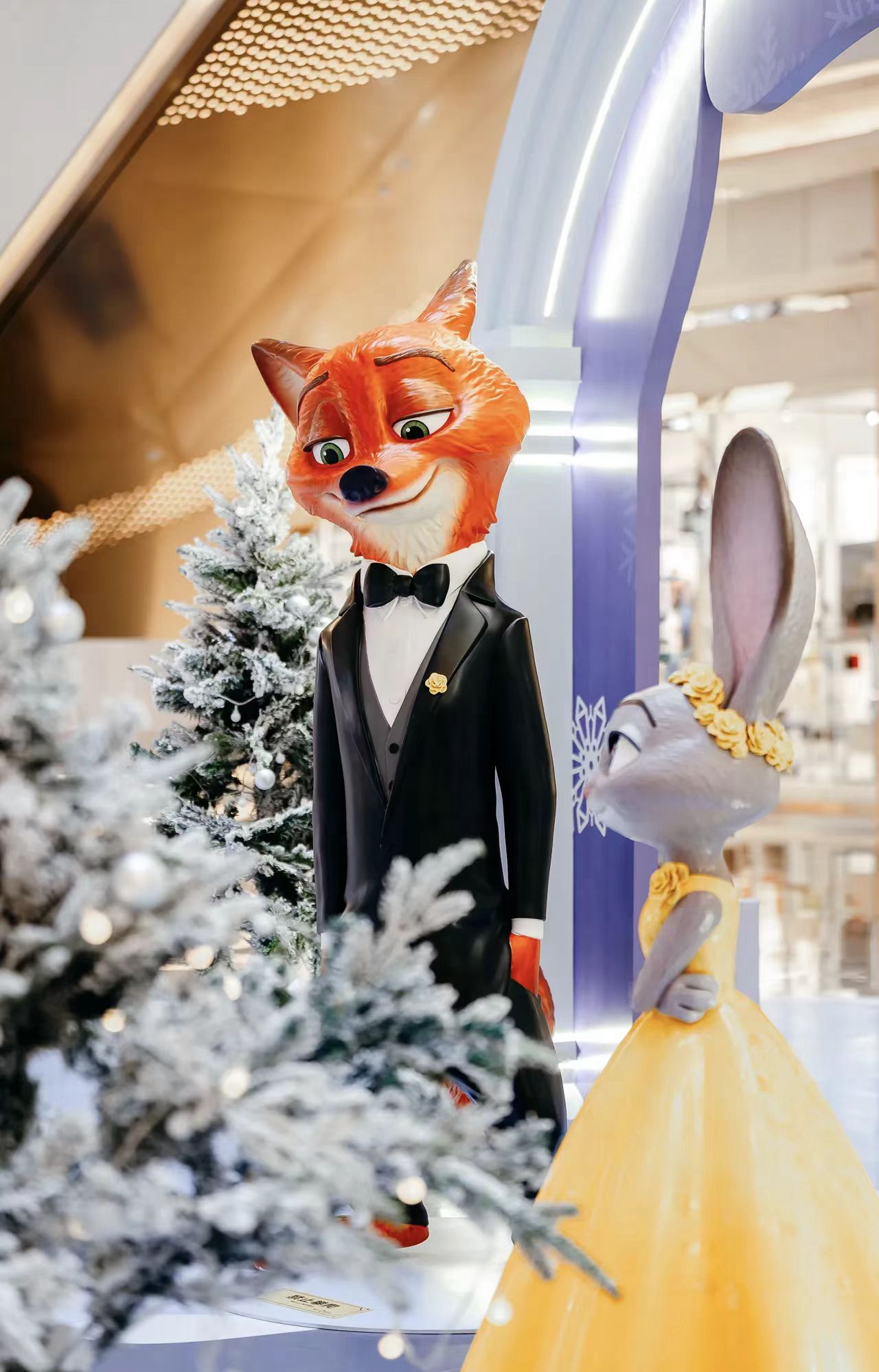 At the shopping mall’s West Zone (Level 1), visitors are greeted by Nick and Judy’s dazzling new looks from “Zootopia 2.” Nick appears in a sleek black tuxedo with shimmering trim, a stylish waistcoat and a classic bow tie, while Judy wears a bold yellow one-shoulder ballgown with a matching headpiece, recreating the film’s elegant Zootennial Gala.