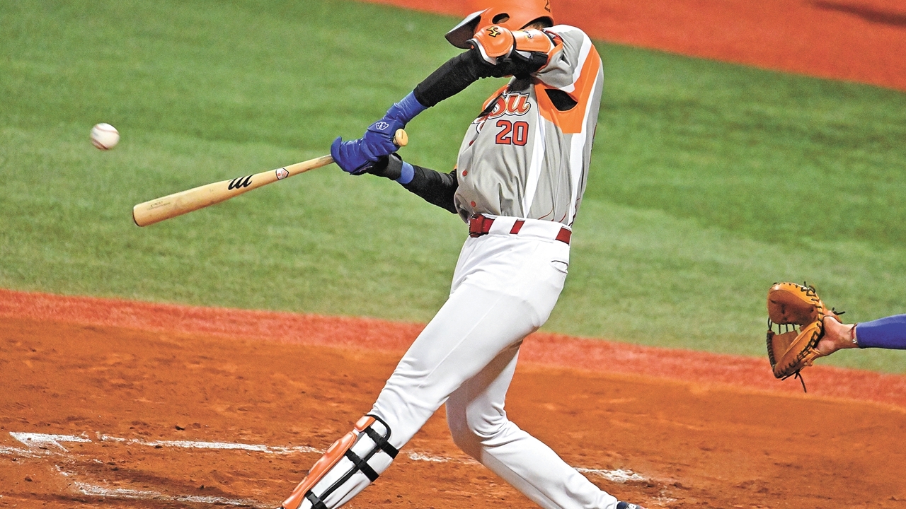 Team Jiangsu’s player Cao Jie takes a swing during the baseball gold medal match against Team Guangdong at the 15th National Games in Zhongshan, Guangdong Province, on Nov. 20. Jiangsu beat Guangdong 11–2 to secure the championship. Xinhua