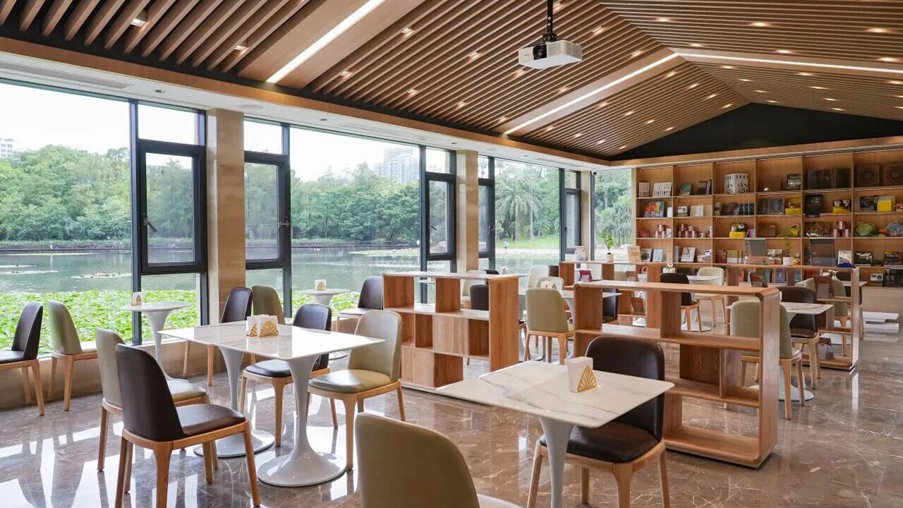 Lihu Bookhouse in Lychee Park combines reading, book sales, light dining, cultural exhibitions and other events in a serene lakeside setting. Photo from WeChat official account "美丽深圳"