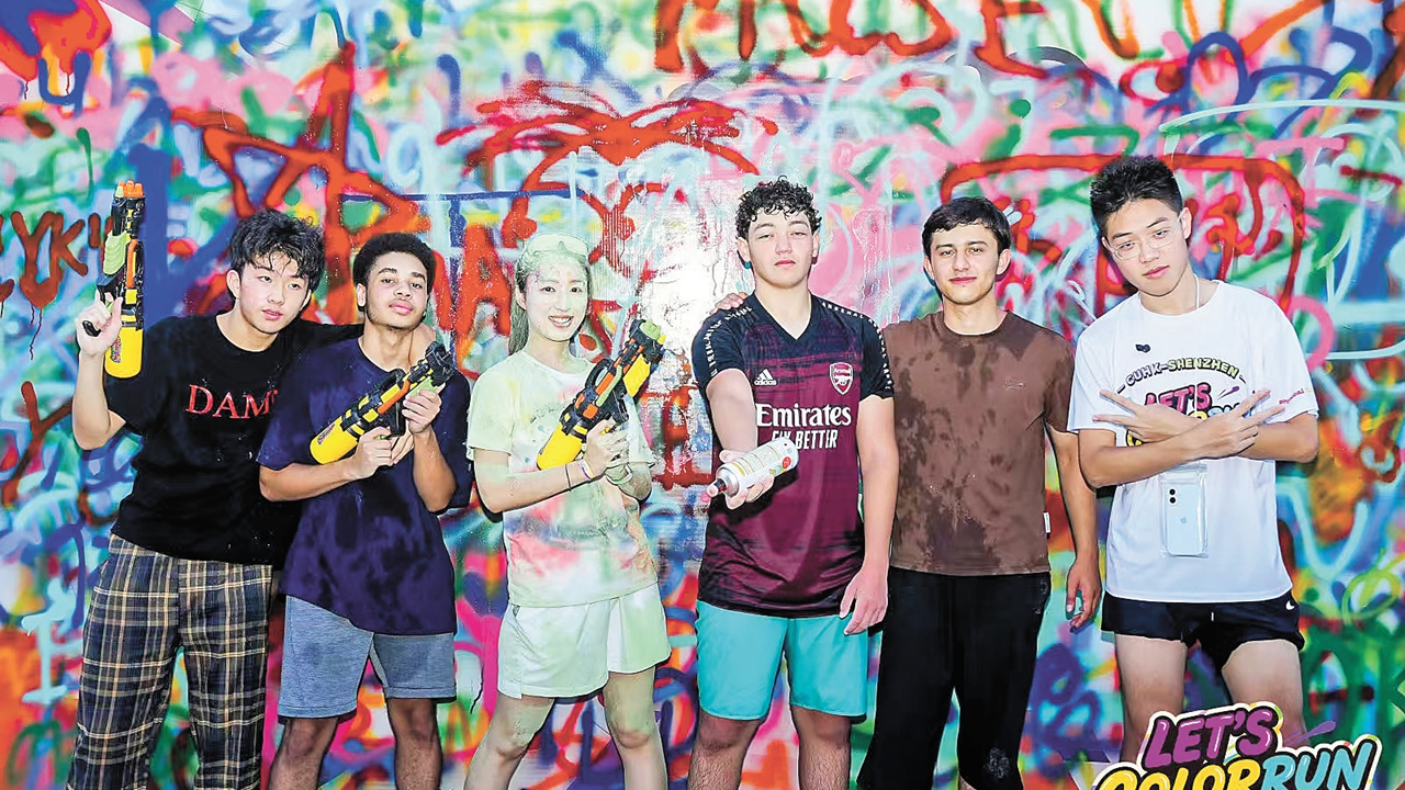 Rayan Boukhanifi (3rd, R) and his schoolmates pose for a group photo at a color run festival hosted by the university.