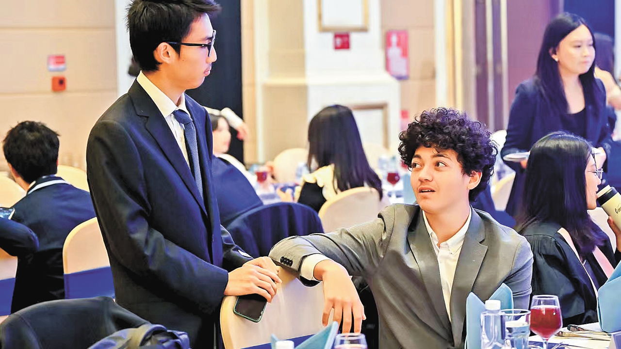 Rayan Boukhanifi (R) and his schoolmates pose for a photo during a High Table Dinner event hosted by CUHK-Shenzhen.