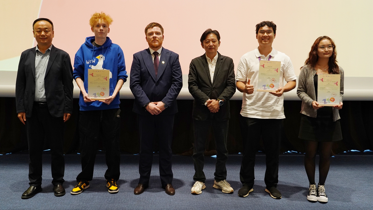 Hungarian student Weszely Bence Tamás of the Peking University HSBC Business School (2nd L) receives an award certificate alongside other winners and presenters during the “Amazing Shenzhen” Global Gen Z Creative Story Contest award ceremony in Qianhai on Friday.