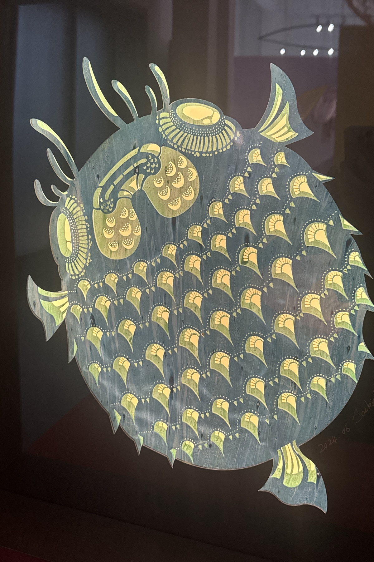 In the darkened space, installations cast mottled shadows under carefully directed lighting, evoking the faint glow of creatures in the deep sea.