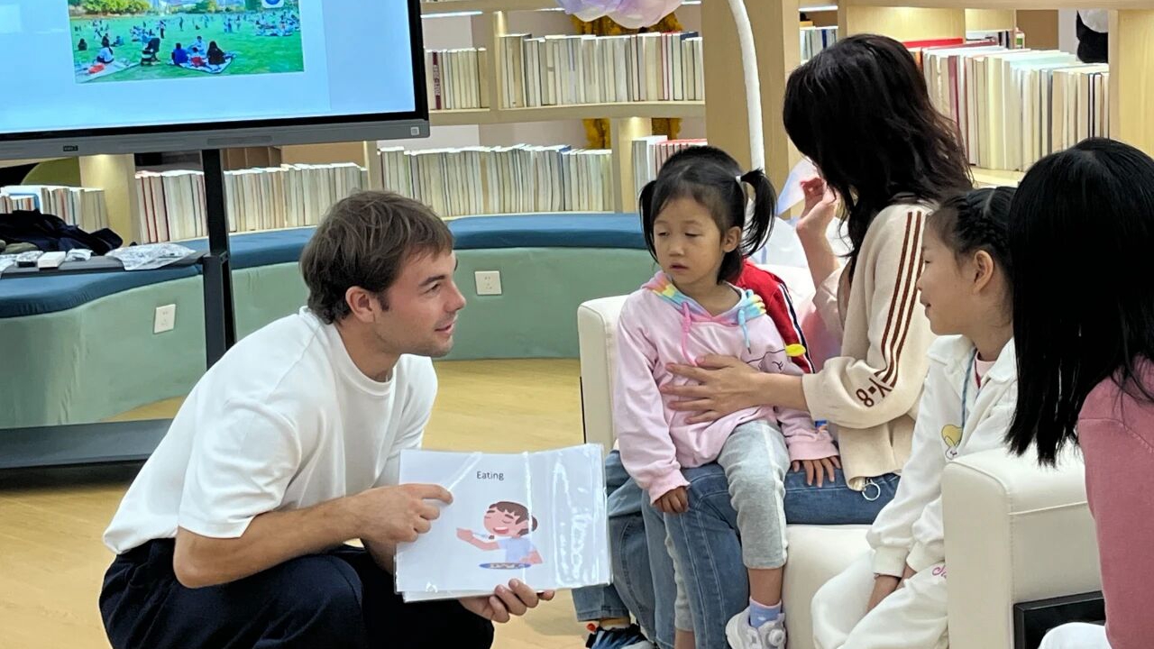 An expat teacher engages local kids during a parent-child English session at the center Saturday.