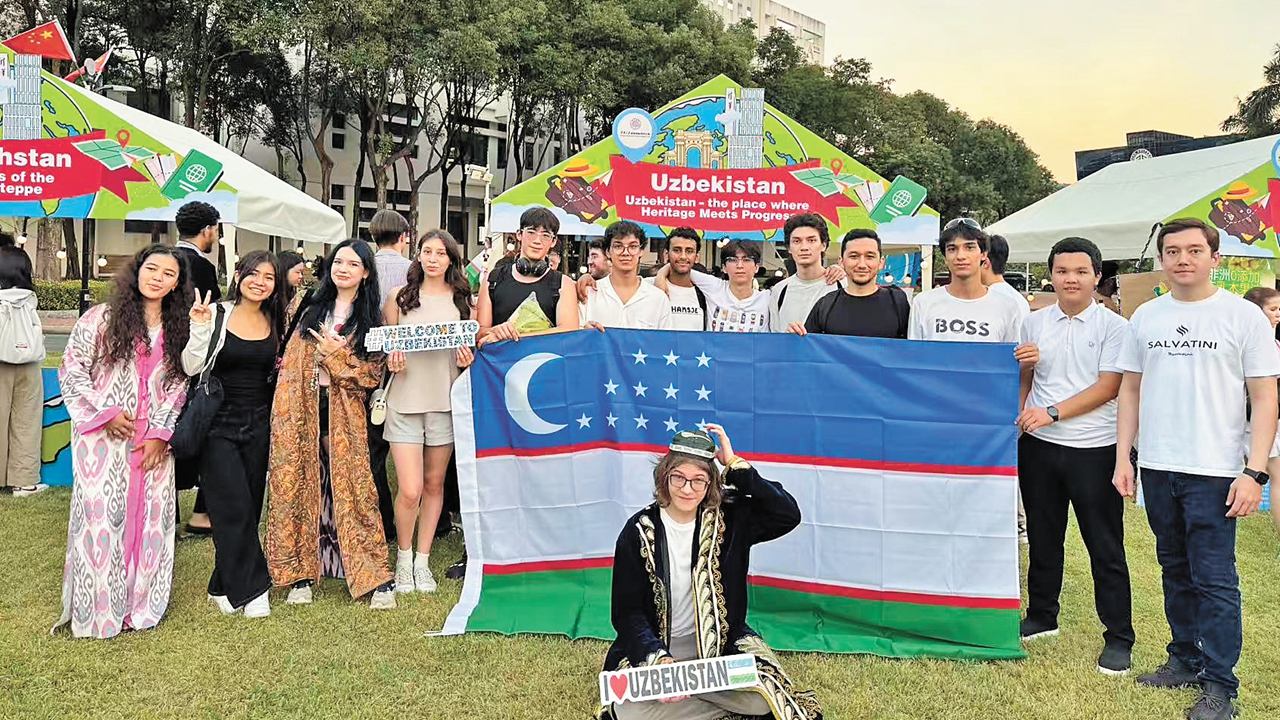 Ziganshin Artur Radikovich (front) and other Uzbek students pose for a group photo at the SIGS Cultural Carnival at the Tsinghua SIGS campus in Xili, Nanshan District, on Oct. 11. Photos courtesy of the interviewee
