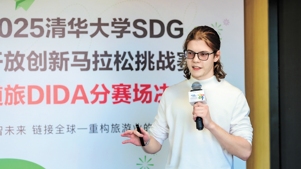Ziganshin Artur Radikovich gives a presentation at the final of the 2025 Tsinghua University SDG Open Innovation Hackathon in Beijing on Nov. 21.