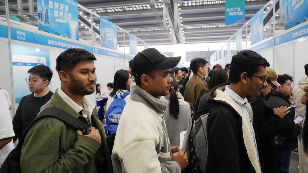 Samin Mohammad Abdullah (2nd L), a student from Bangladesh, waits in line with fellow jobseekers at the employment fair held at the Shenzhen Convention and Exhibition Center on Saturday.