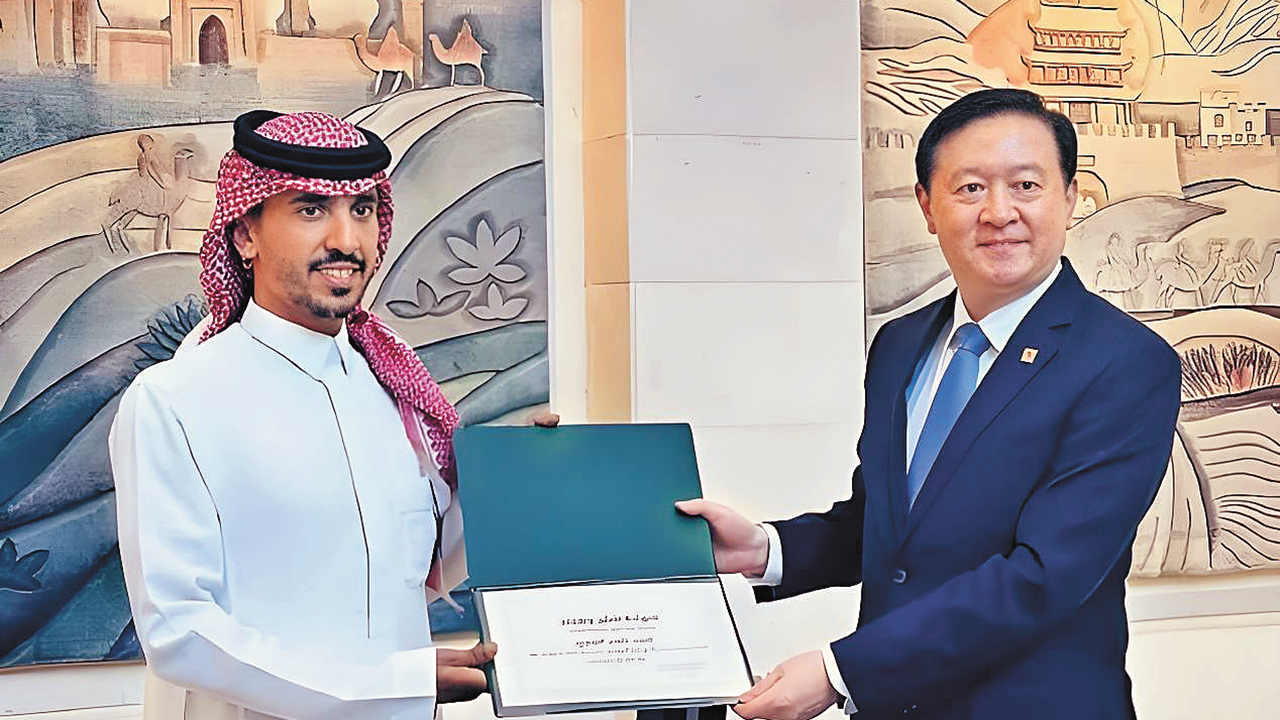 Chang Hua (R), Ambassador of China to Saudi Arabia, presents a certificate of appreciation to Ahmed Nasser AlAnzi in recognition of his bravery. Courtesy of Ambassy of China in Saudi Arabia