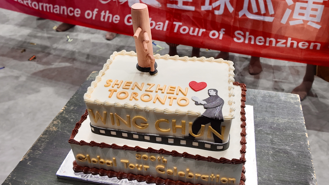 A commemorative cake marking the 300th global performance of “Wing Chun” is displayed after the show at Meridian Hall in Toronto, Canada.