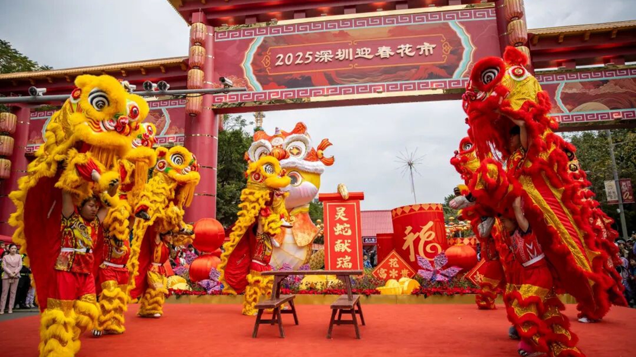 A lion dance performance at the 2025 Aiguo Road Flower Fair.