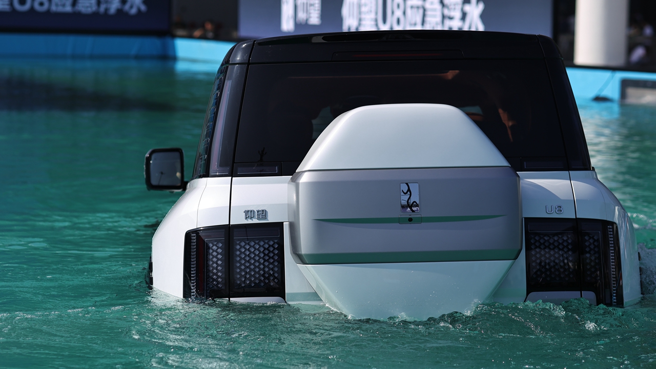 Visitors watch a demonstration of Yangwang U8's emergency floating function at the 2025 Guangdong-Hong Kong-Macao Greater Bay Area Auto Show.
