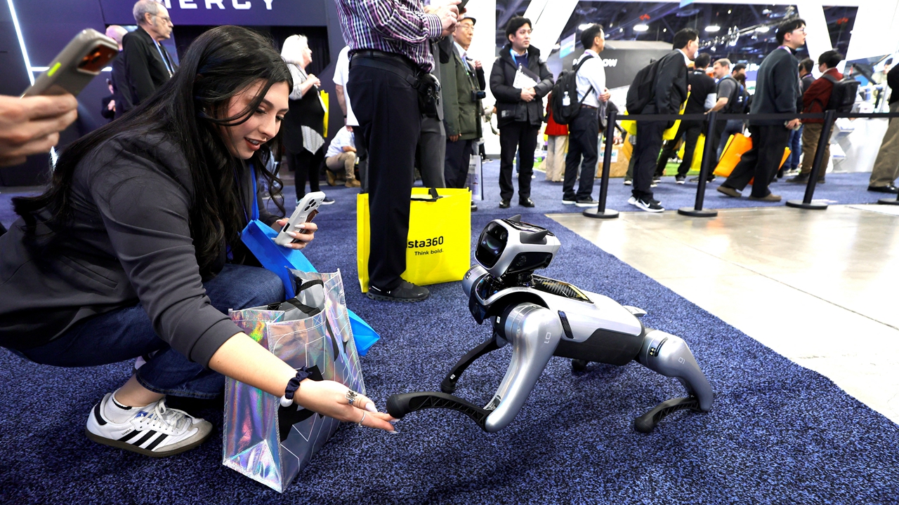 A visitor interacts with a robot dog at the 2026 Consumer Electronics Show (CES), which opened in Las Vegas, the U.S., on Tuesday. Xinhua