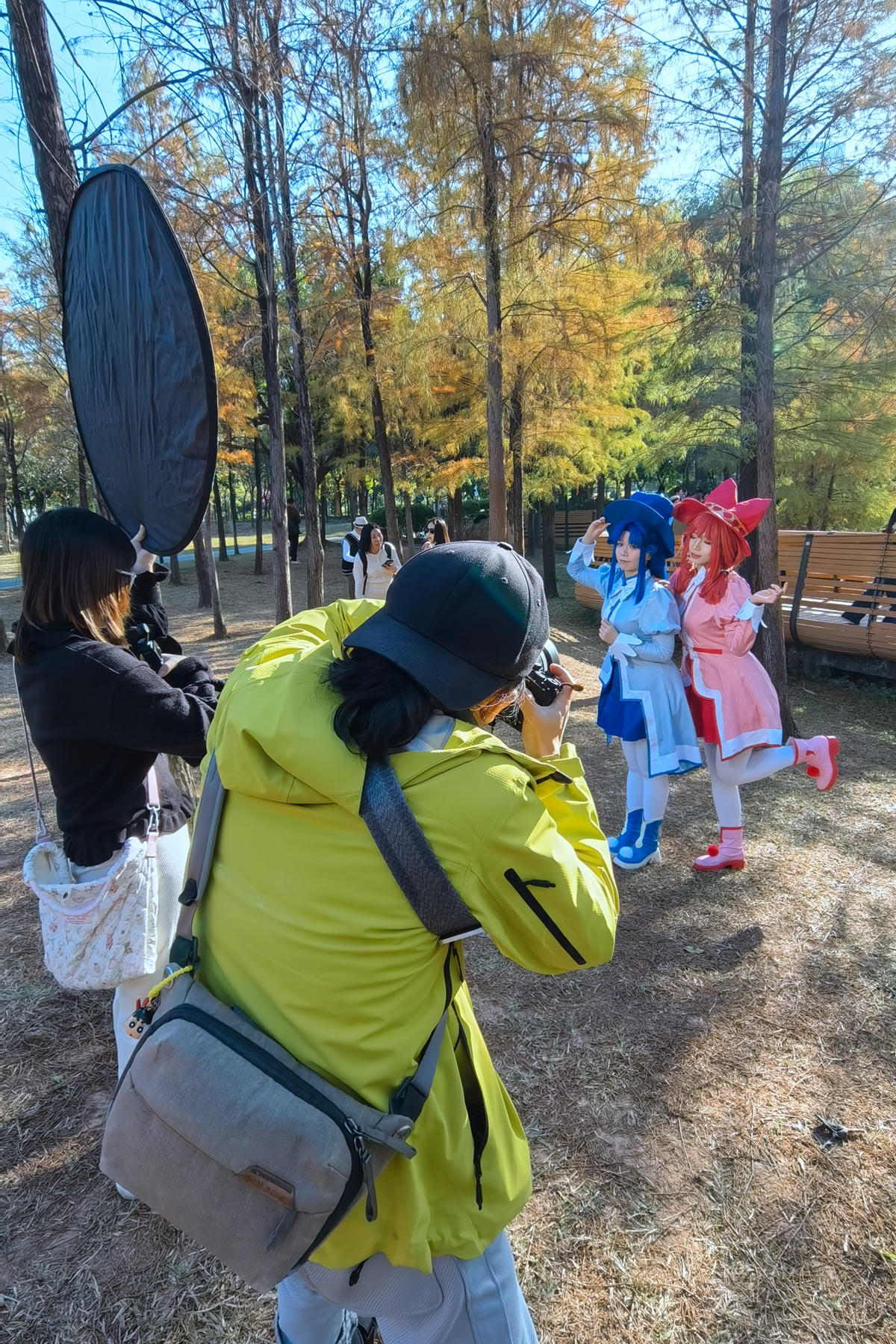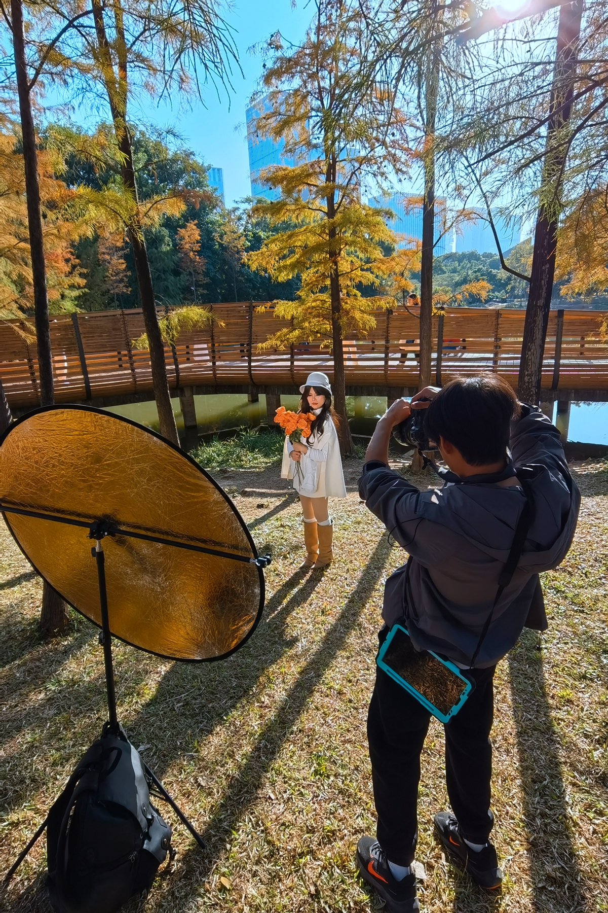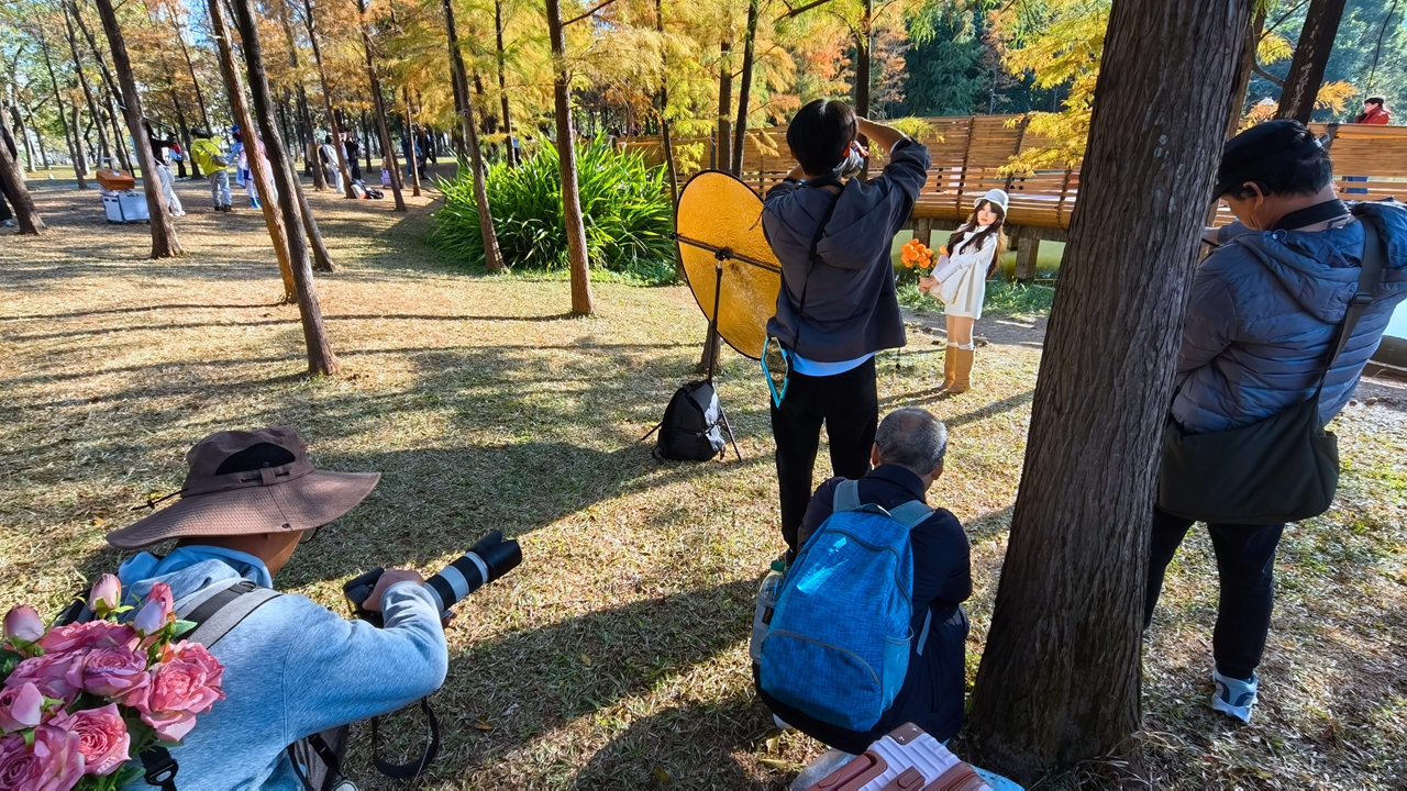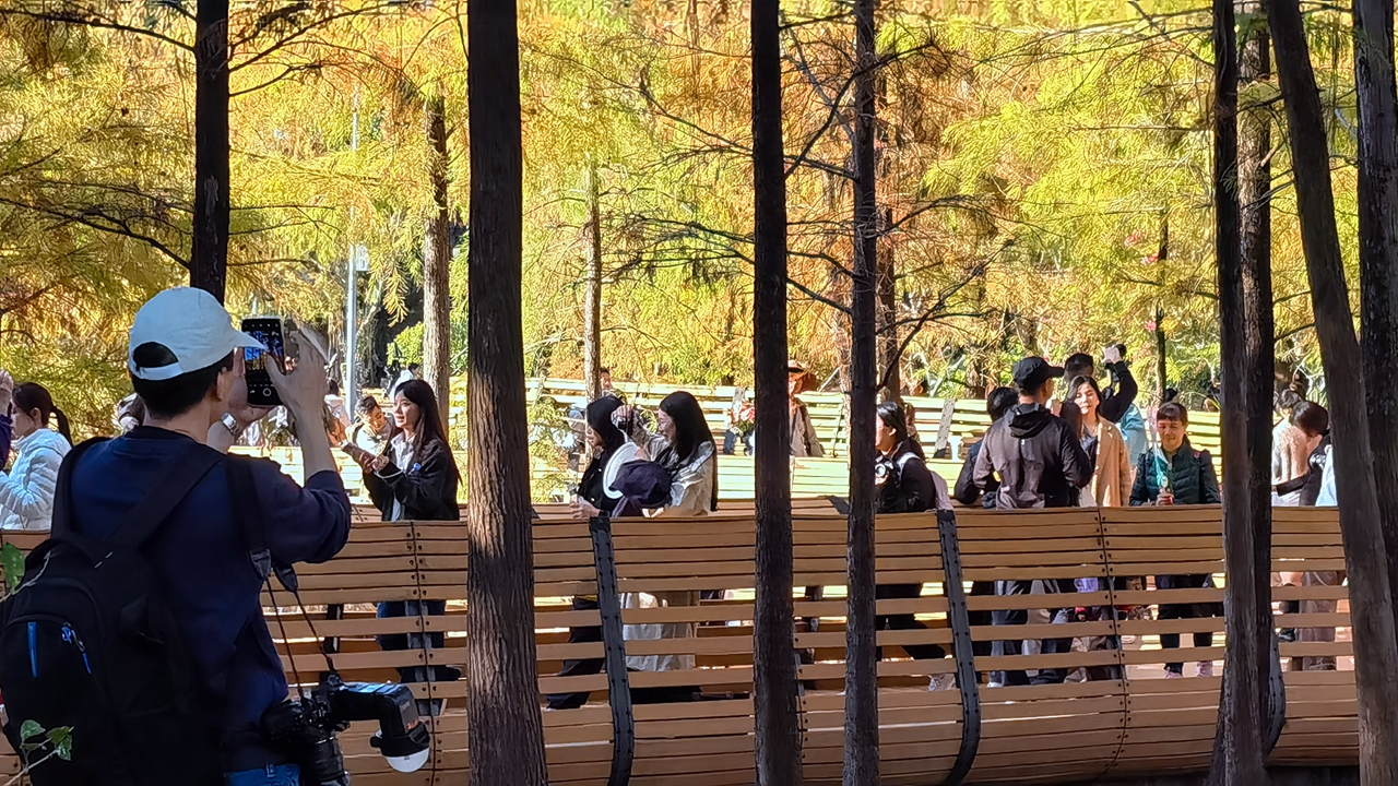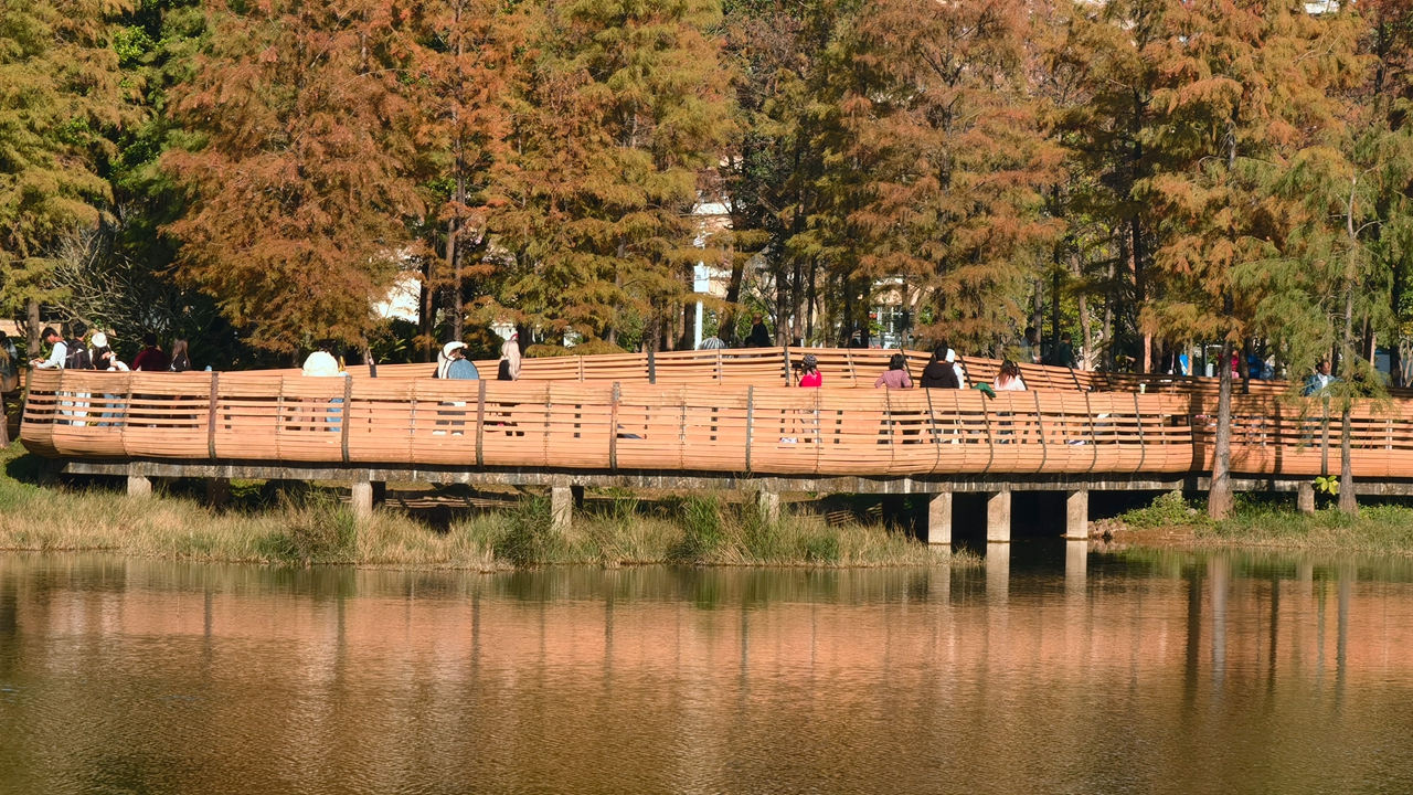 On a winter afternoon, sunlight spills across the lawns of the Lianhua Hill Park. Along the lakeshore, rows of bald cypresses stand in quiet splendor, their multi-hued leaves shimmering like stained glass in the gentle light. The water mirrors their brilliance, creating a scene that feels both serene and magical.