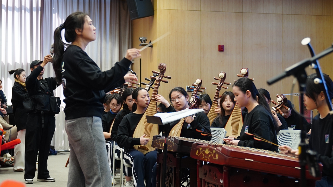 Members of Shenzhen Middle School's folk orchestra perform on stage.