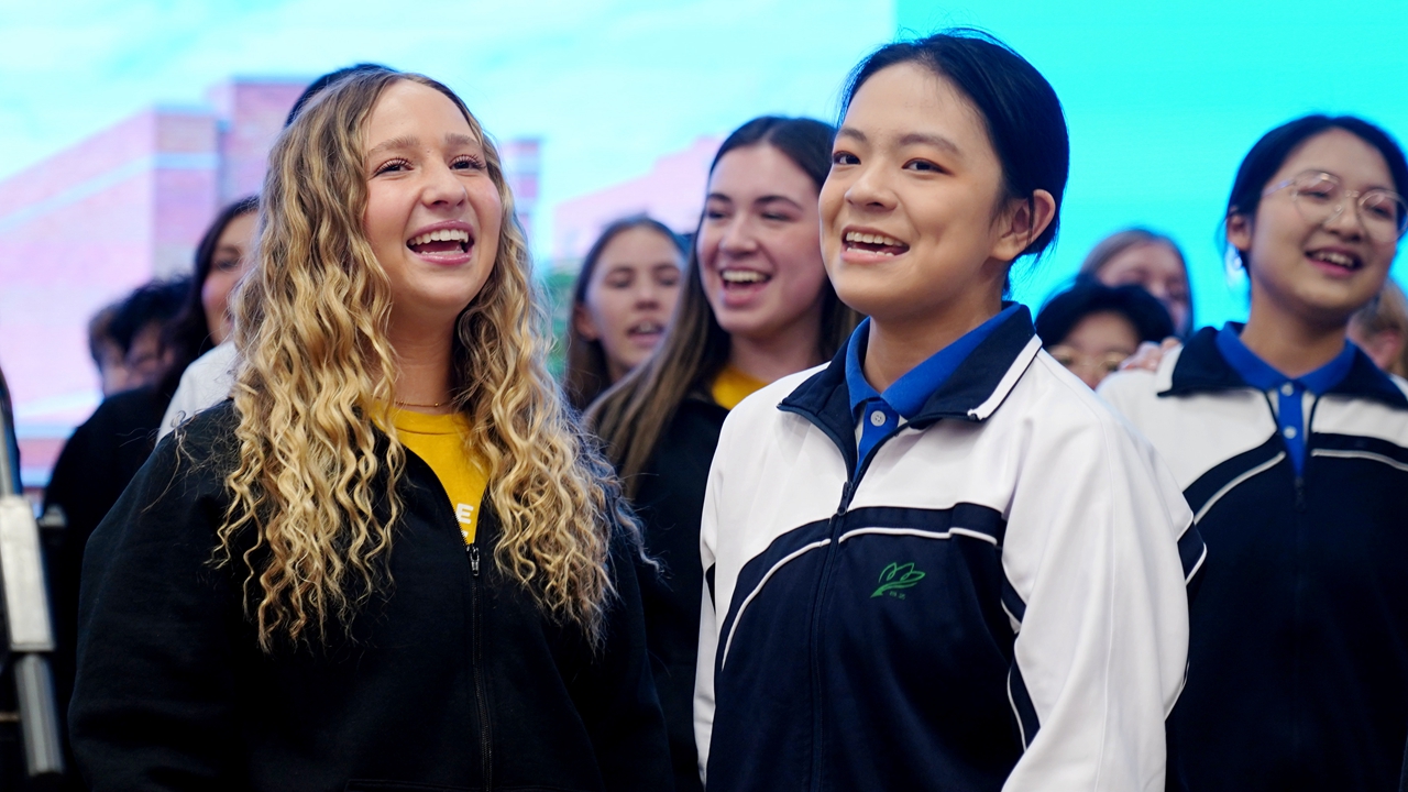 Chinese and American teenagers sing a song together.