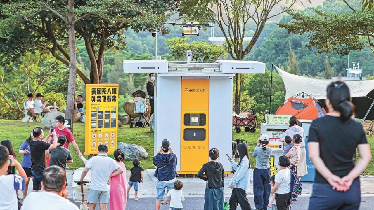 Park visitors watch as a Meituan drone lands on a designated platform at Baishilong Music Park in Longhua. Shenzhen Special Zone Daily