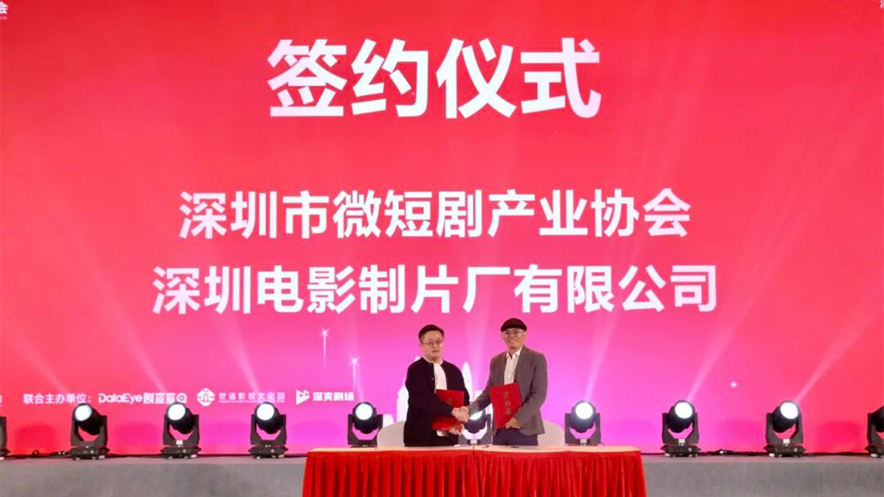 The Shenzhen Microdrama Industry Association signs an agreement with Shenzhen Film Studio during the launch ceremony of the association in Pingshan District on Jan. 17.