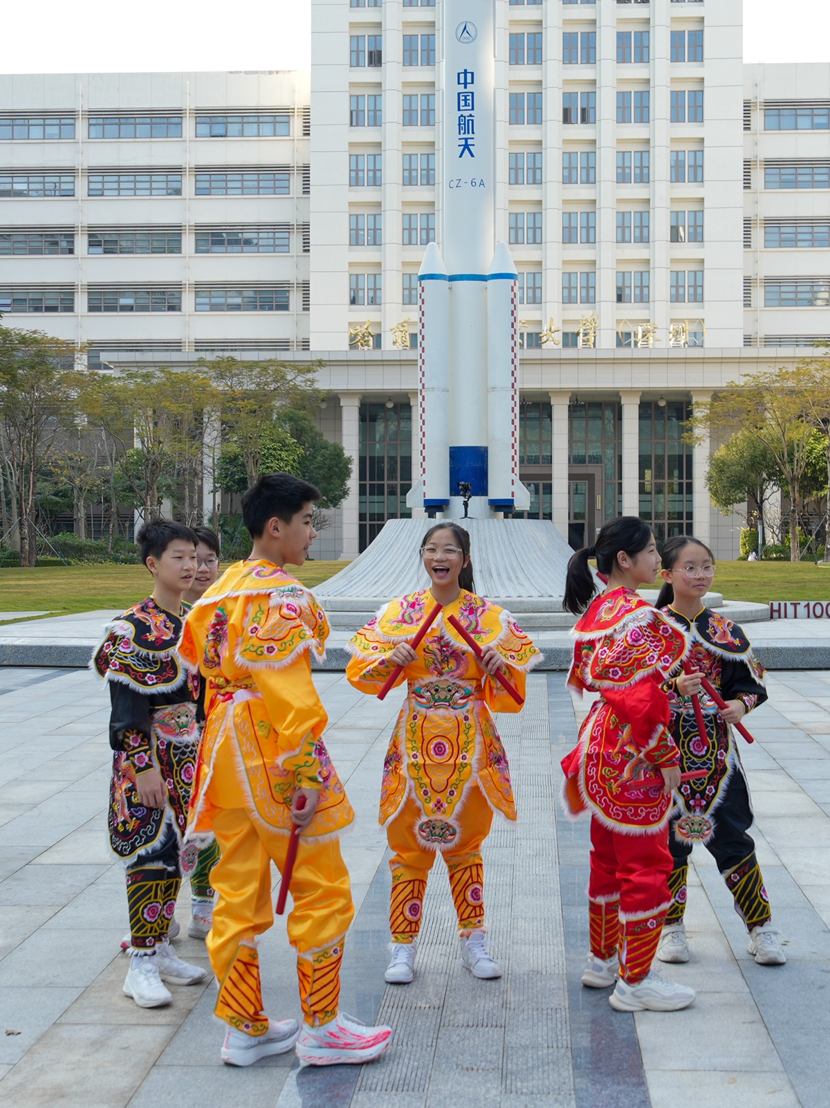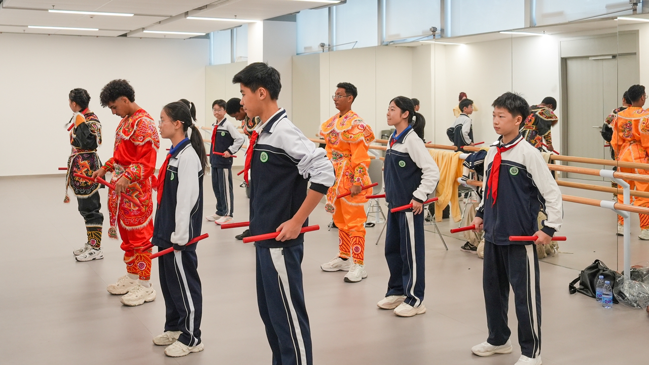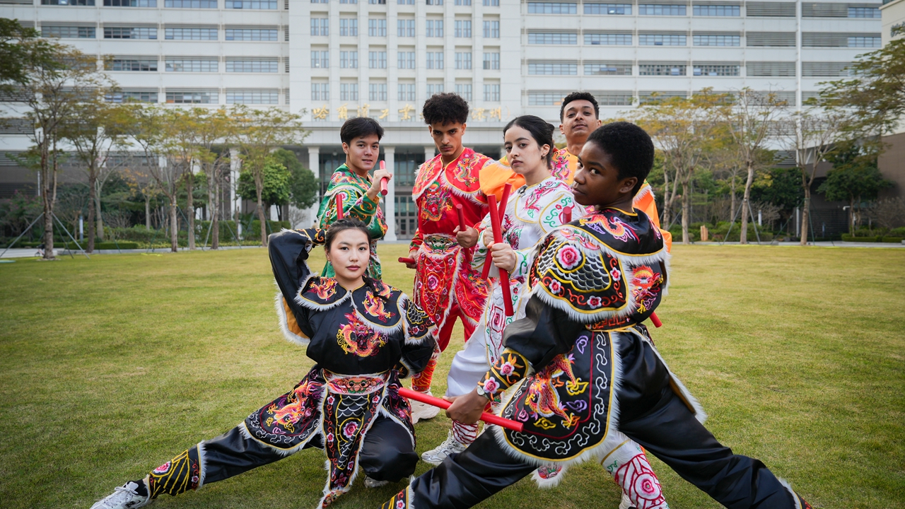 Dressed in vibrant costumes and holding traditional red batons, a group of international Generation Z students strike a dynamic pose during a rehearsal of Yingge Dance at the Harbin Institute of Technology, Shenzhen, on Sunday. Photos by Lin Jianping